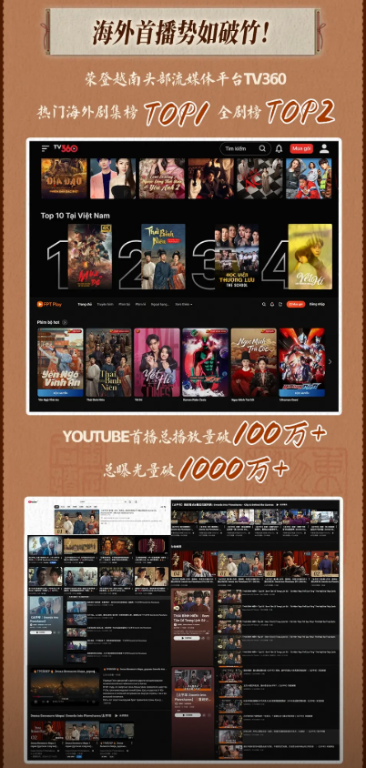 播出数据亮眼:YouTube 首播播放量破百万,北美 Viki 平台斩获 9.3 分高口碑,越南 TV360 登顶海外剧榜单,韩国 MOA 电视台同步跟播热播,预计全球触达观众超 3 亿人次,实现收视与口碑双丰收。