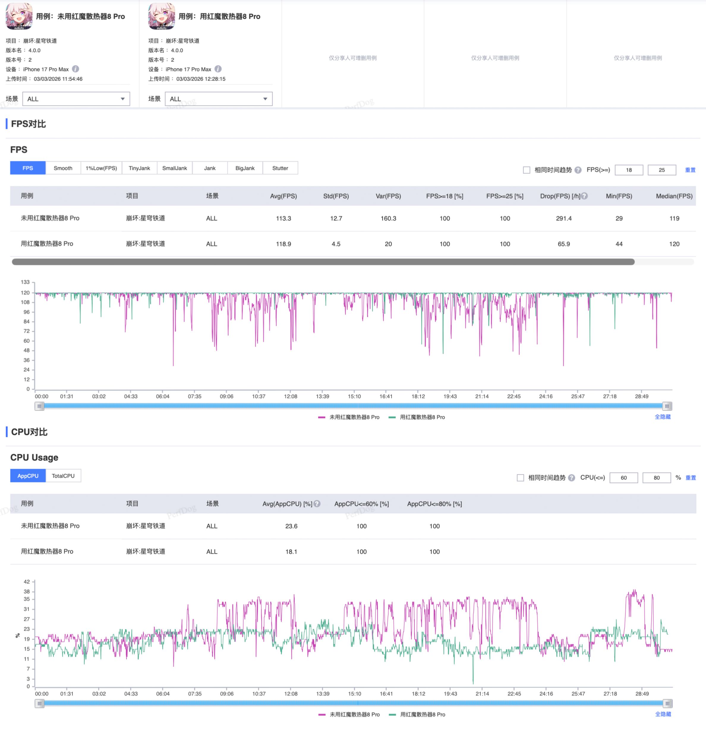 帧率方面,无散热器时平均帧率113.3帧,但游戏过程掉帧、卡顿明显;搭配散热器后,卡顿大幅减少,平均帧率提升至118.9帧。另外,PerfDog监测到的数据显示,散热器能让CPU保持高频运行的时间更长,从而实现更稳定、更极致的性能释放。