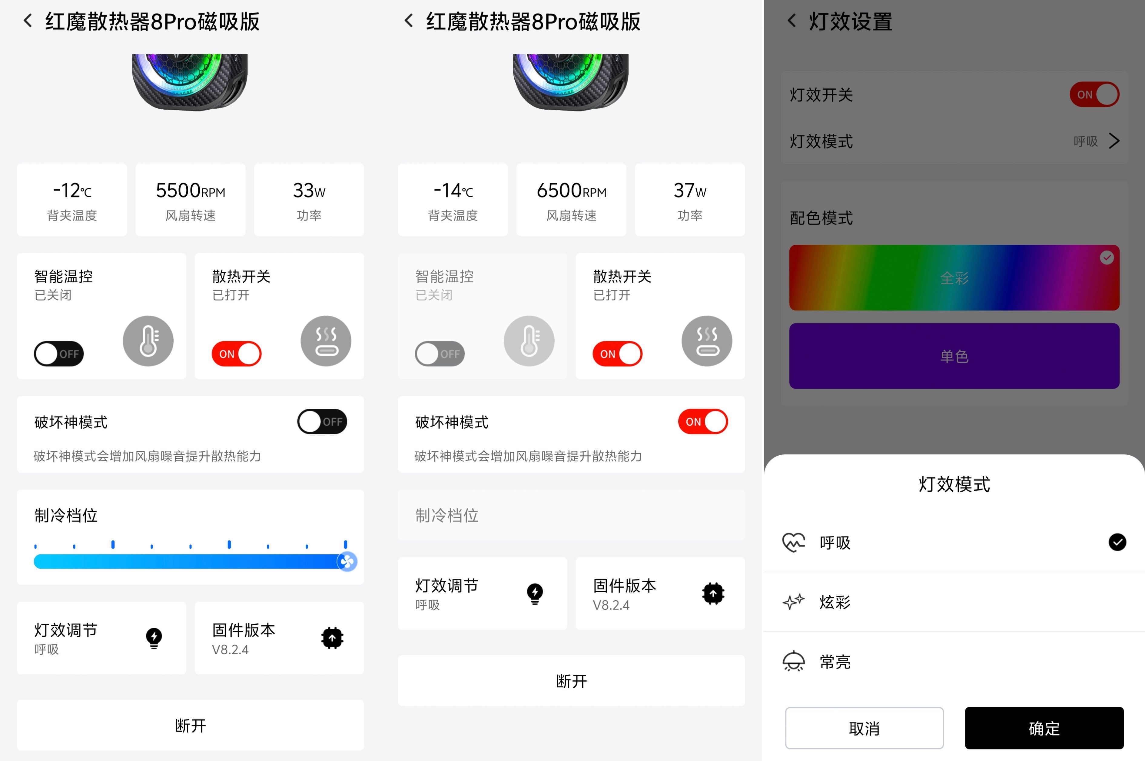 在APP内,用户可对散热功率、灯光效果等进行精细调节,满足不同场景需求。风扇制冷档位提供了10档可选。其中“破坏神模式”为性能全开档位,开启后散热器以36W满功率运行,风扇转速提升至6500转,在制冷效果提升的同时,噪音也会相应增大。除此之外,还有9档可调节的制冷档位,用户可以根据手机温度和使用场景,从低到高精细调节制冷力度,在散热效果和噪音之间找到最适合自己的平衡点。