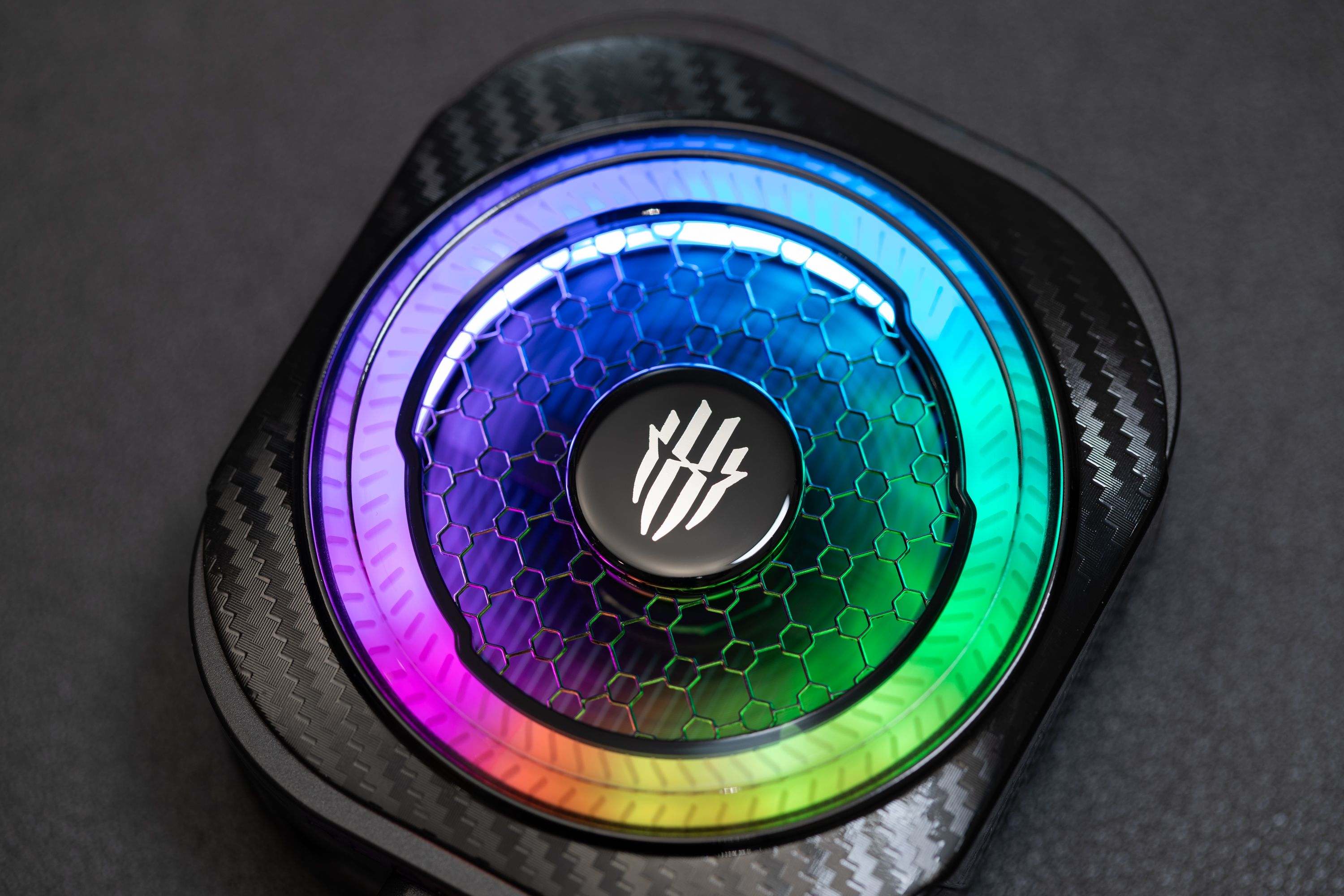 红魔散热器8 Pro延续家族式硬核电竞风格,机身以黑色为主色调,搭配碳纤维纹理点缀,提升了视觉层次感。