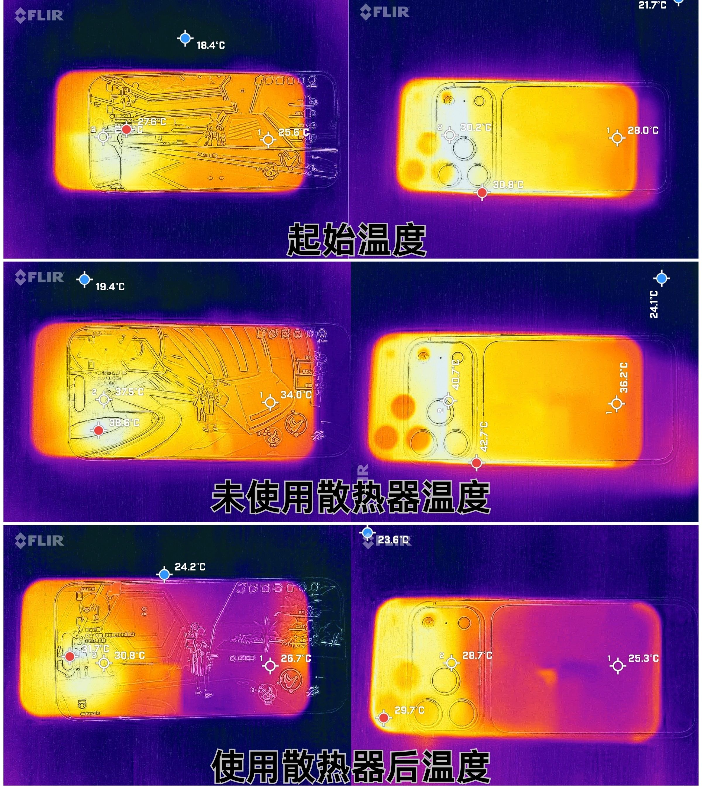 直播场景测试30分钟,使用抖音APP并全程插电。未使用散热器时手机发热明显,最高温度38.2℃;开启智能模式后,机身背部最高温度仅27.9℃,降温超过10℃,效果非常可观。
