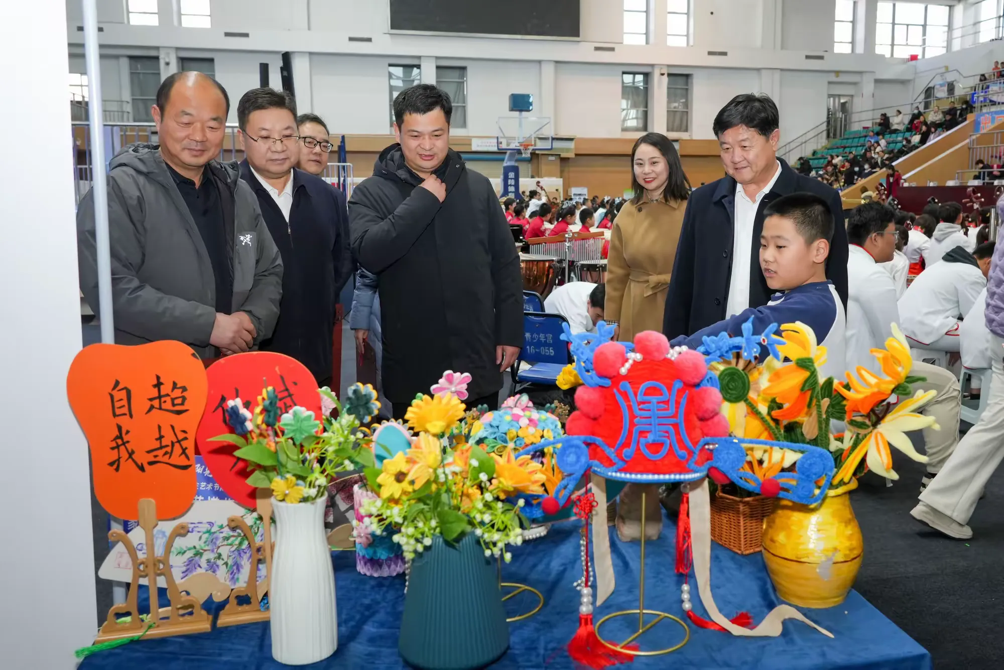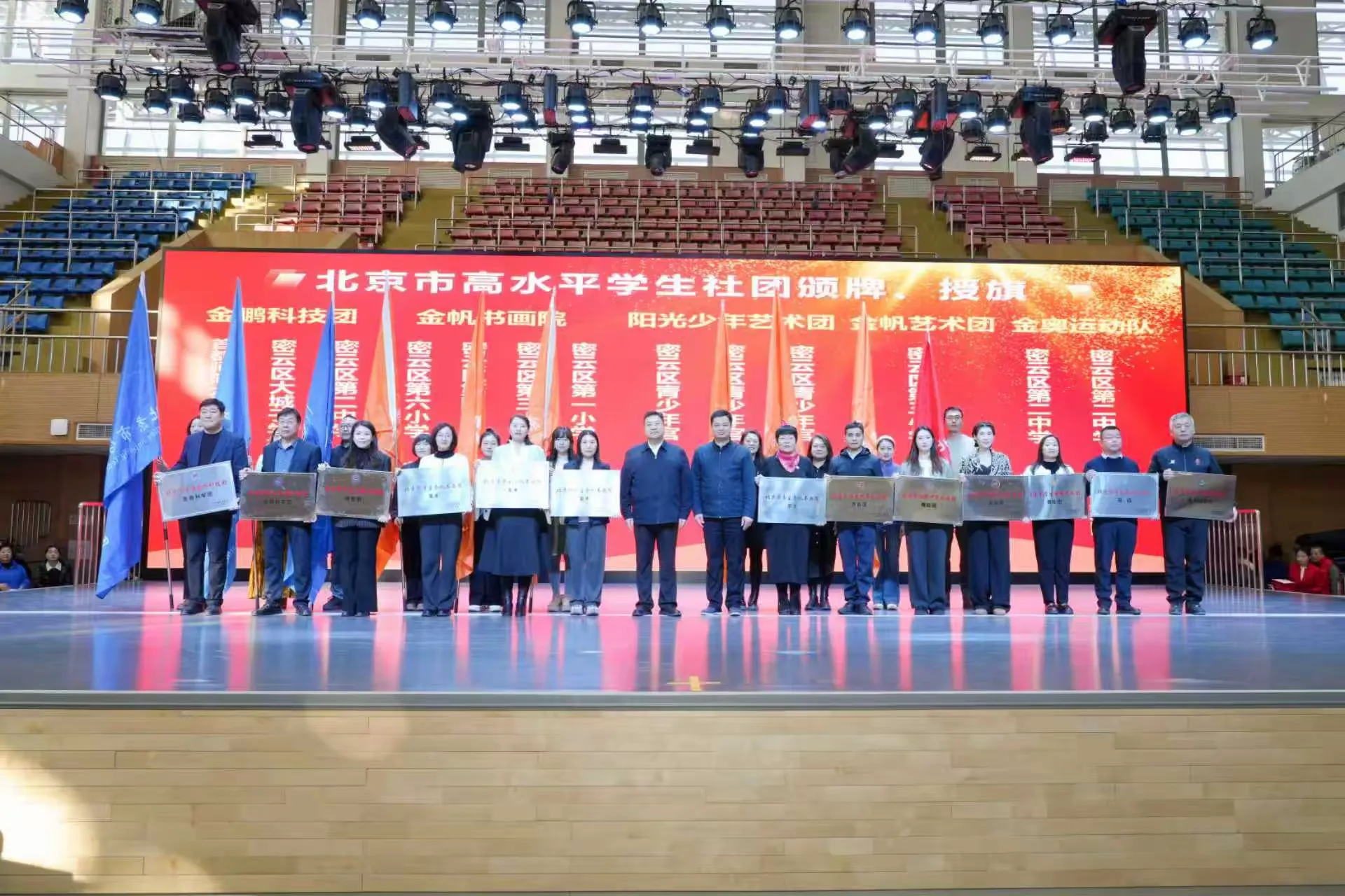 北京市少年宫书记丁贞栋、区委教工委书记杨行辉共同为密云区13个获评北京市级高水平的学生社团颁牌授旗,涵盖金奥运动队、金帆艺术团、金帆书画院、金鹏科技团等多个类别,展现了密云区在体艺科教融合方面的突出成果。