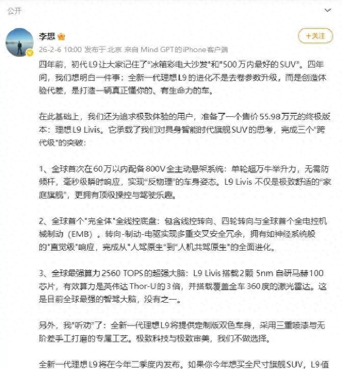 他坦言,新一代L9的逻辑变了,不再是“账面参数内卷”,而是要创造“体验代差”。