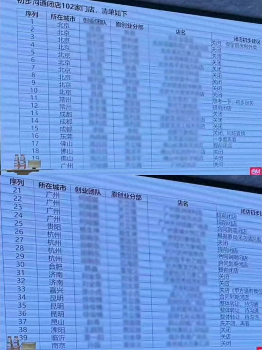此外,东莞、贵阳、合肥等地的西贝门店亦被列入关店名单中,单城关闭1~2家不等,涉及门店约36家;总共计划关闭的门店达102家。