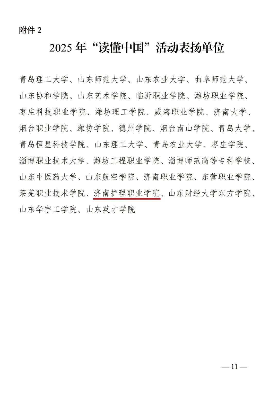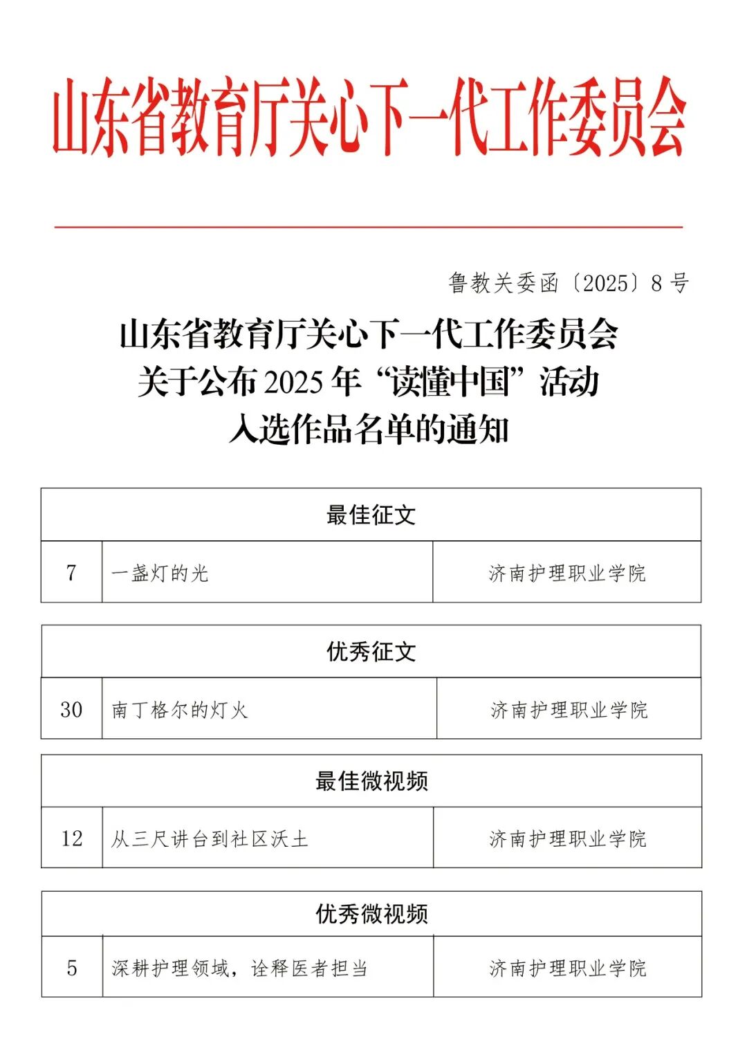 近日,《关于公布2025年“读懂中国”活动入选作品名单的通知》〔鲁教关委函(2025)8号〕公布获奖名单,学院首次参与该活动,选送作品获评最佳微视频、最佳征文等4项大奖,学院被评为“读懂中国”活动表扬单位。