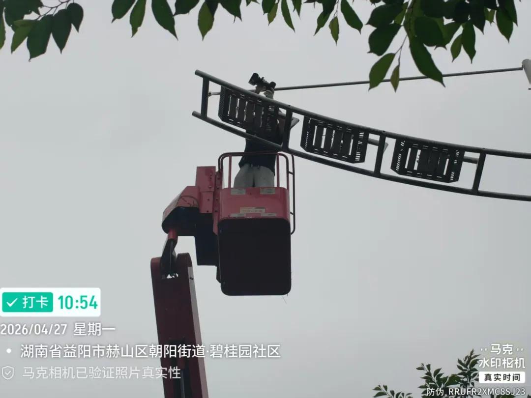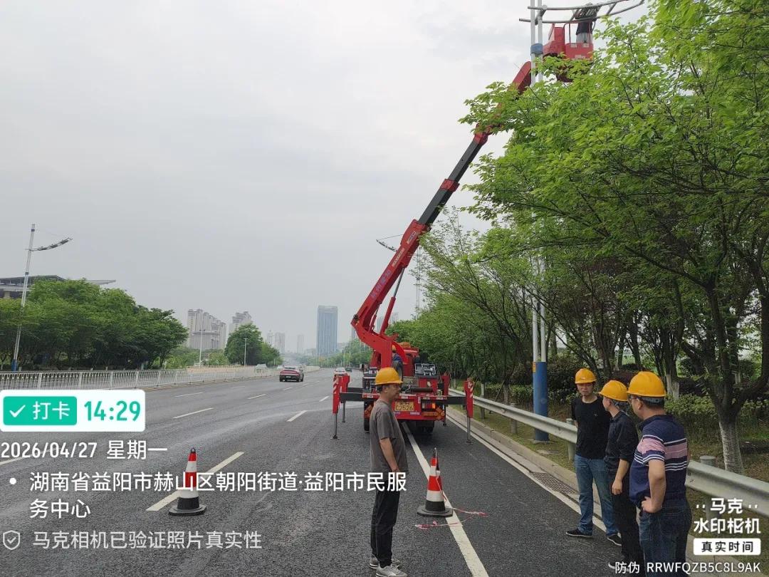 五一假期即将来临,同时为全力保障湖南省第十五届运动会在我市顺利召开,一场与时间赛跑的“光明保卫战”悄然打响。市路灯服务中心展现出强大的队伍战斗力,在短短3天时间内,出动40余名精干力量、5台高空作业车辆,圆满完成迎宾路400余盏路灯的抢修任务。