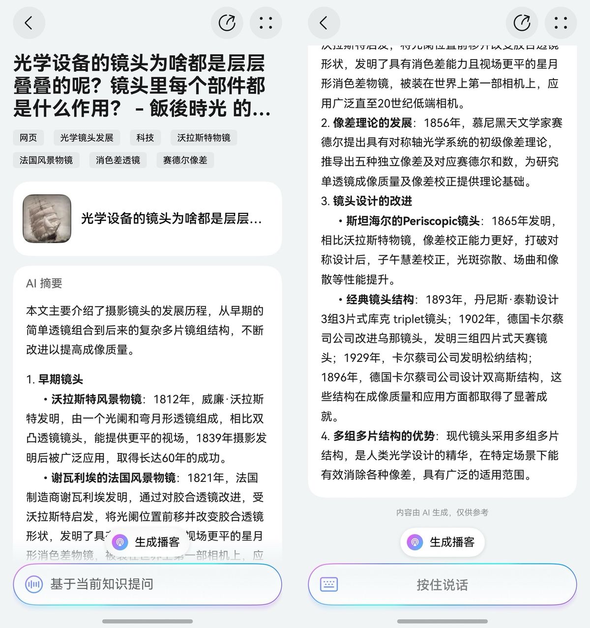 视频中还演示了“AI生成播客”的功能,遇到各类长文章或报道,可以快速生成播客,碎片化时间随时听,方便又高效。