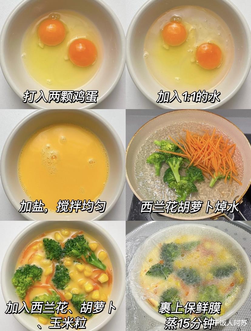 然后将焯好水的西兰花、胡萝卜和玉米粒一起加入到搅拌好的蛋液中。玉米粒的加入为这道菜增添了一丝甜味和嚼劲,使口感更加丰富。所有食材混合均匀后,用保鲜膜将碗口封好,扎几个小孔,以便蒸汽流通。这一步能有效防止蒸制过程中水蒸气滴入蛋液,影响成品的美观和口感。