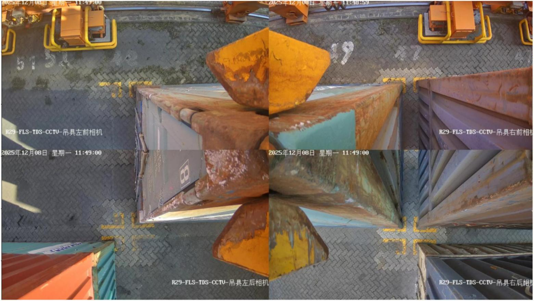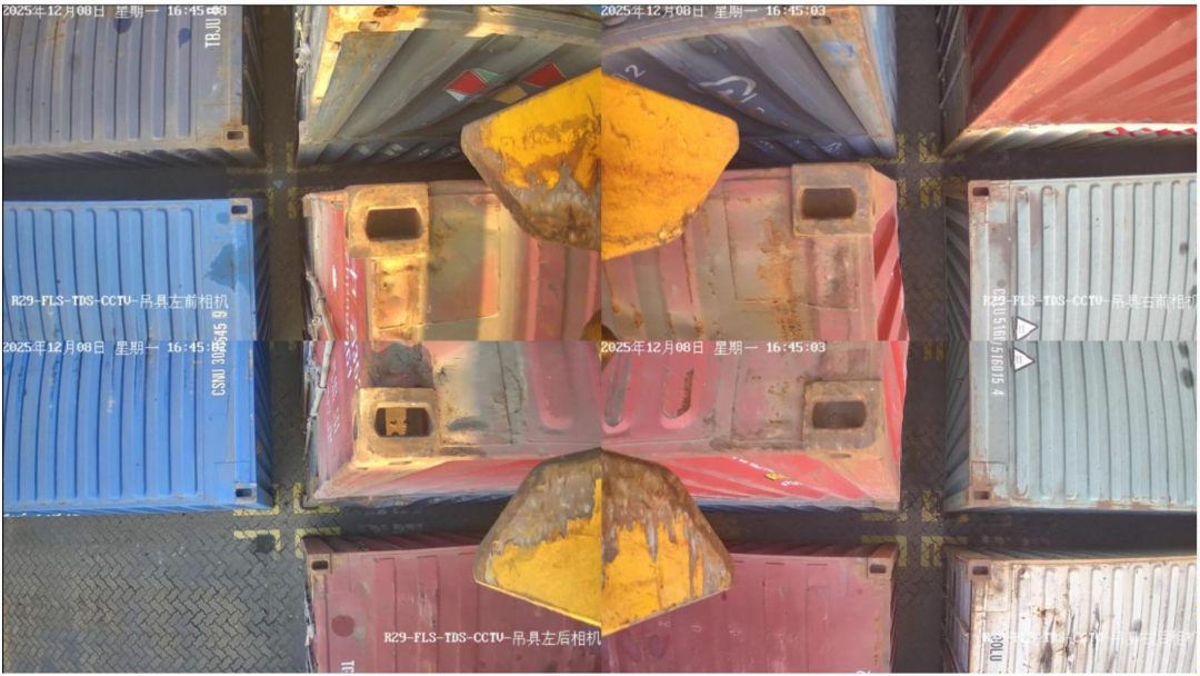 海睿未来的视觉着箱系统(Visual Final Landing System)选择了一条不同的技术路径:极简硬件 + 算法补偿。仅复用吊具上原有的4个CCTV 相机,通过多模态前融合与专用视觉基础模型,实现了从首层着箱、精准抓箱到高层叠箱的全流程自动化。