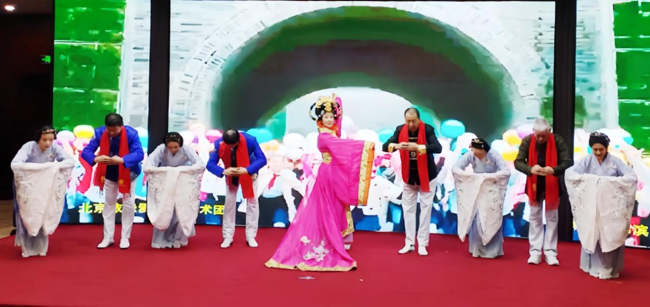 舞蹈类节目兼具美感与内涵。东方老年研修学院依缘爱心艺术团编排的歌伴舞汉服秀《礼乐兴邦》,由薛滨导演、陶虹配乐演唱,表演者身着汉服,举止优雅,将东方古典美与中华礼仪完美融合,结尾谢幕尽显礼仪之邦的谦虚内敛,赢得掌声不断。河北大学古汉语在读博士研究生范美琳带来古典水袖舞《千年》,作为文艺爱好者,她将中国古典舞的快动作与戏曲慢动作相结合,飞身甩袖、起承转合,身姿摇曳、神韵兼备,仿佛穿越千年时空,用肢体语言传递古典美学魅力。11岁的孙美辰是本场晚会年龄最小的演员,她带来的独舞《梦中的额吉》曾登上赤峰电视台,将武术与现代舞相结合,刚柔并济、身手敏捷,生动表达了草原赤子对母亲的眷恋与感恩,传递出蒙古族文化中母性的崇高与温暖。延庆京郊麒翔艺术队带来的汉族民间舞蹈《担花篮》,搭配唢呐《百鸟朝凤》的欢快旋律,近20名舞者或担花篮、或持舞扇,扭秧歌、抬花轿,队形不断变换,喜气洋洋的模样将春节的喜庆氛围推向高潮,观众纷纷击掌互动。