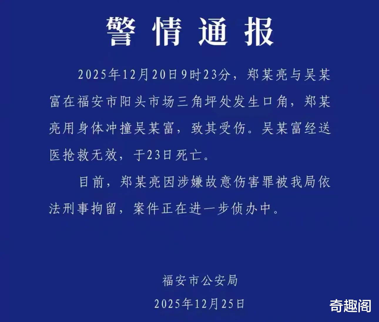 事发后,老人吴某富被紧急送往医抢救,但是最终于12月23日,因为抢救无效而死亡。2025年12月25日,福安市警方对此事进行了通报。根据通报,身穿城管制服的男子郑某亮,因为涉嫌故意伤害罪已经被依法刑事拘留,案件正在调查中。