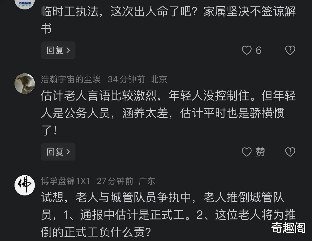 此前当地城管局,也对此事件作出了回应,该局工作人员向媒体证实,当事城管队员在事发当天已经被停职,涉事的郑某亮为临时工。这件事情发生后,有多位目击者发声,讲述了详情。一位附近商户称,还像是因为摆摊儿发生了口角,老人辱骂了城管,之后就看到城管把老人推倒了。