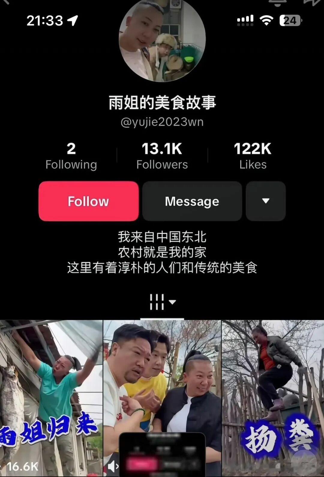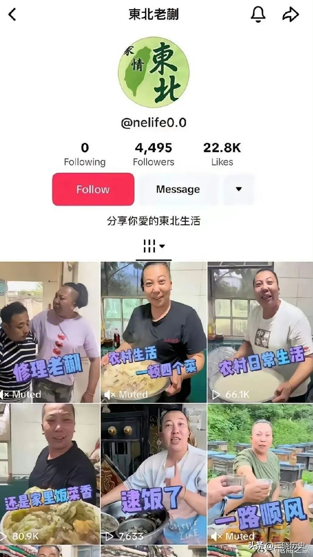 为此,东北雨姐似乎转战到了TikTok。在TikTok平台上,发现了不止一个疑似东北雨姐的账号。其中,“雨姐的美食账号”已积累一万多的粉丝,“东北老蒯”粉丝四千多。这两个账号的内容,遵循着东北雨姐一贯的风格,多是记录农村日常生活和做饭过程。