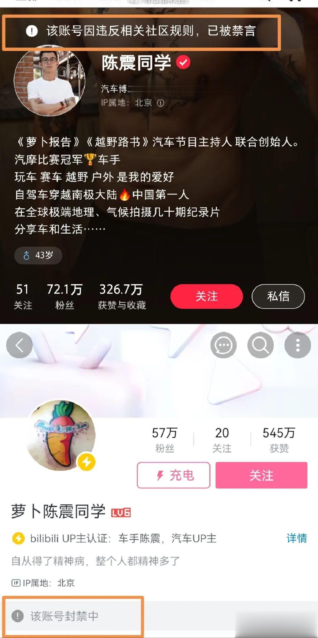 在网友的讨论中,事情迎来了反转。因为陈震的小红书、B站账号再次被禁言。其中,小红书显示“该账号因违反相关社区规则,已被禁言”,B站账号显示“该账号封禁中”。