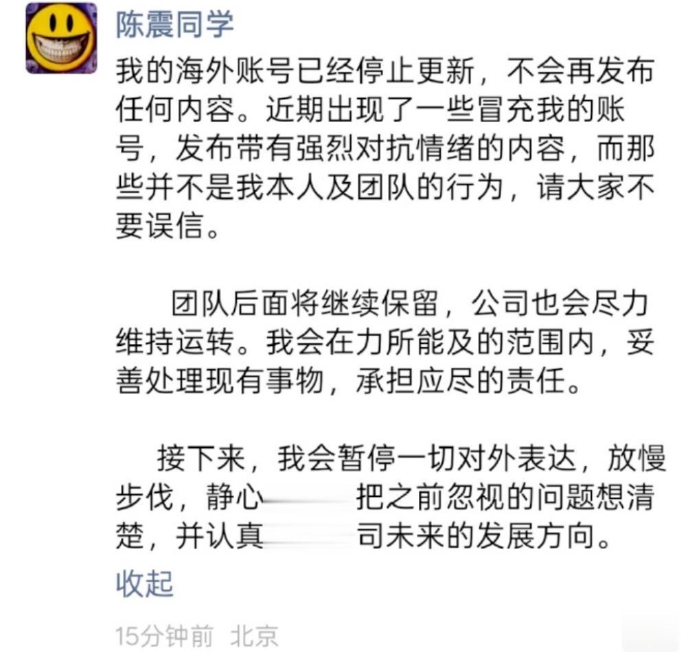 回过头来看,这更像是一场乌龙。毕竟,陈震的抖音、微博账号一直都还保持着“禁言”状态。