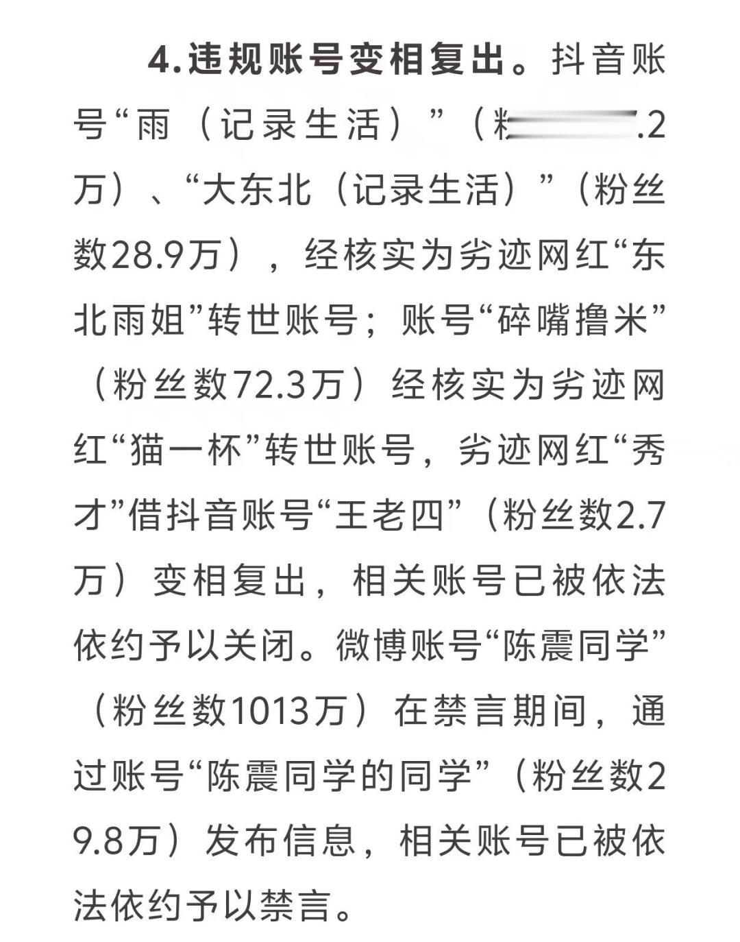据网信北京消息,劣迹网红东北雨姐借抖音账号“雨(记录生活)”“大东北(记录生活)”变相复出;劣迹网红“猫一杯”借账号“碎嘴撸米”变相复出;劣迹网红“秀才”借抖音账号“王老四”变相复出,相关账号已被依法依约予以关闭。