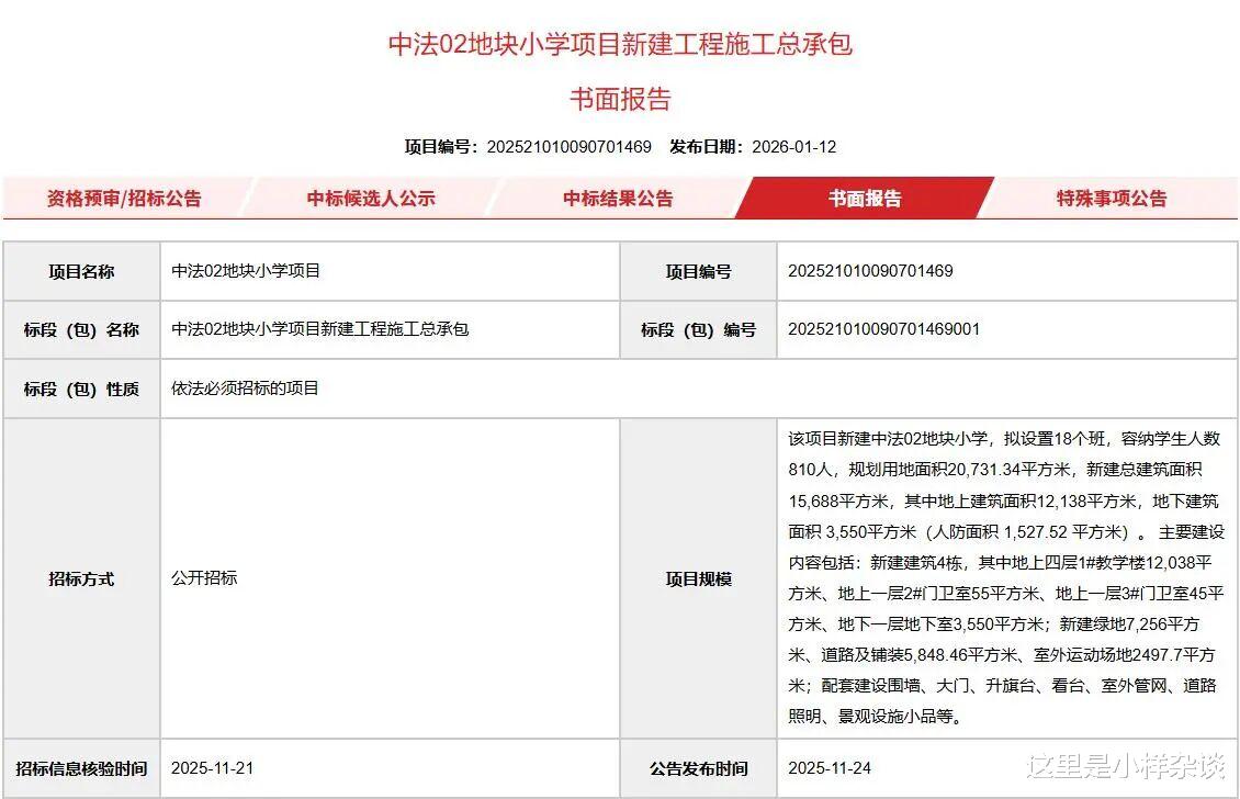 (图片来源于网络)这块地就是后来的龙湖·中德开春江悦茗项目。住宅项目在2023年9月25日顺利交付第一批,2024年6月25日顺利交付第二批。房子是顺利交付了,但是配套的中小学并没有同时交付。都不是停工,也没有没有开工,是根本都没有动迁呢,学校所在地块都没有进行征收呢,2023年6月的时候有关部门的回复是:经向相关部门了解核实,目前龙湖学校项目正在全力推进。由相关领导牵头负责,教育局、征收办、自然资源局及中德开等相关部门各负其责,相互配合,已进入勘察设计工作时段,待规划出图后即可开工建设。虽然全力推进了,但是直到两年后的2025年才有了动静,虽然北侧的中学部分依然没有征收成功,但是南侧的小学部分终于征收完成了,并进行了中法02地块小学项目新建工程施工总承包招标公告的公示。