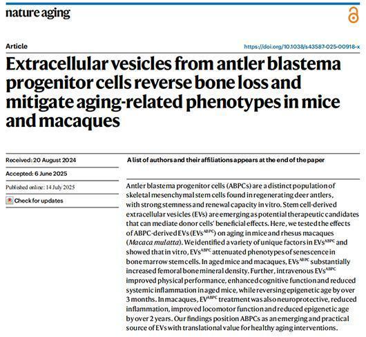 吉林敖东大力投入研发,聚焦核心物质基础研究,布局抗衰与再生医学前沿,推动中医药从“经验传承”向“科学解码”跨越。持续追踪挖掘鹿茸现代科研价值:国际期刊《细胞发现》证实鹿茸中“尿苷”具备抗衰修复作用,《自然・衰老》验证鹿茸干细胞外囊泡可逆转动物模型骨质流失、减轻神经炎症,甚至使恒河猴生物学年龄平均“年轻”2.14年。这些研究,为鹿茸传统功效提供现代注解。