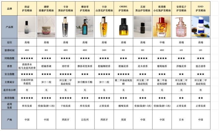 下面是这几款护发精油的基础数据。