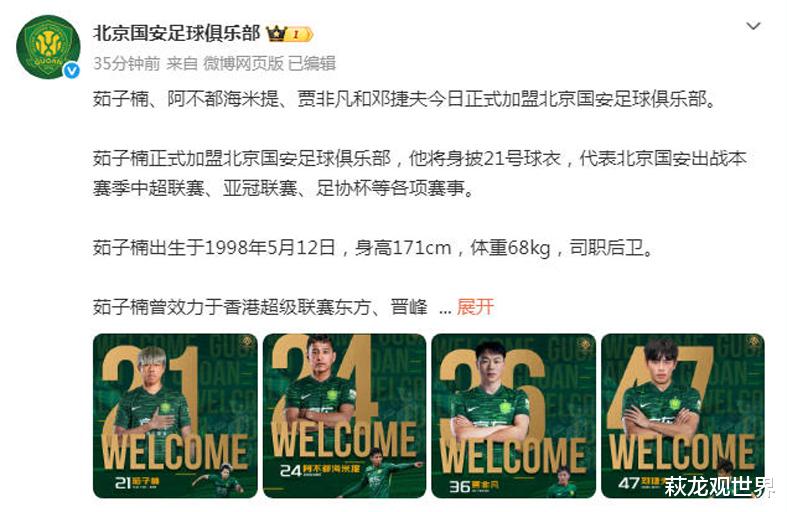 1月14日,除了官宣王刚、池忠国续约之外,国安还官宣茹子楠、阿不都海米提、贾非凡和邓捷夫正式加盟俱乐部。新赛季,新的管理层架构、新主帅、三线作战充满很多不确定。自上而下的大变动是俱乐部这些年最大一次调整,希望在充满变数的赛季平稳过渡。此外,杨立瑜也会留队。