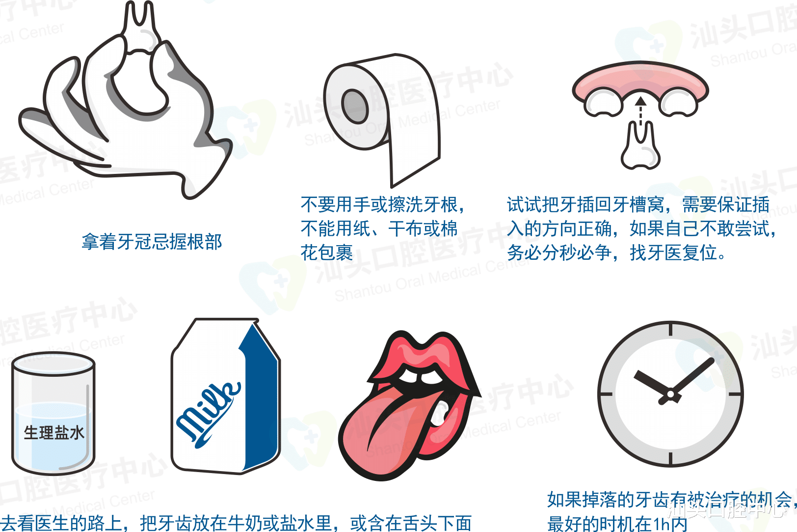 可以先用清水轻轻冲洗脱落的牙齿,注意不要碰牙齿根部。如果条件允许,可将牙齿放入牛奶或生理盐水里保存,不要晾干。立即带孩子去医院,医生会判断是否需要复位,或进行止血、消炎处理。