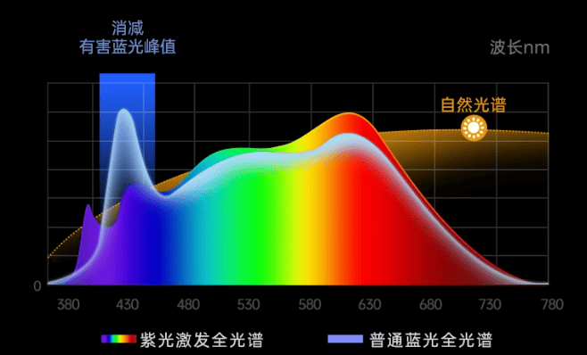 学生护眼台灯怎么选购?建议挑选具备紫光激发技术的款式,因为长期暴露于蓝光环境中,尤其是450nm蓝光,会增加视网膜损伤的风险。紫光激发的护眼灯能够有效降低蓝光对视网膜的伤害,因为紫光激发技术避免了450nm的高能蓝光峰,并且光谱中的紫光波段具有良好的生物学效应,可以进一步保护眼睛的健康。