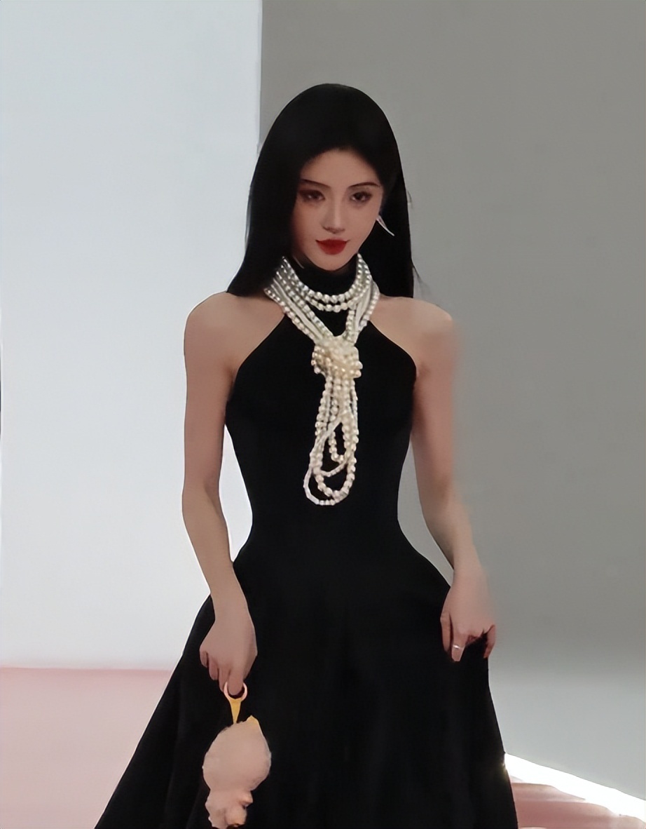 走红毯环节,她穿了一套黑色挂脖礼服,脖子上叠戴着一大串珍珠项链,和款式简约的礼服形成强烈的反差。