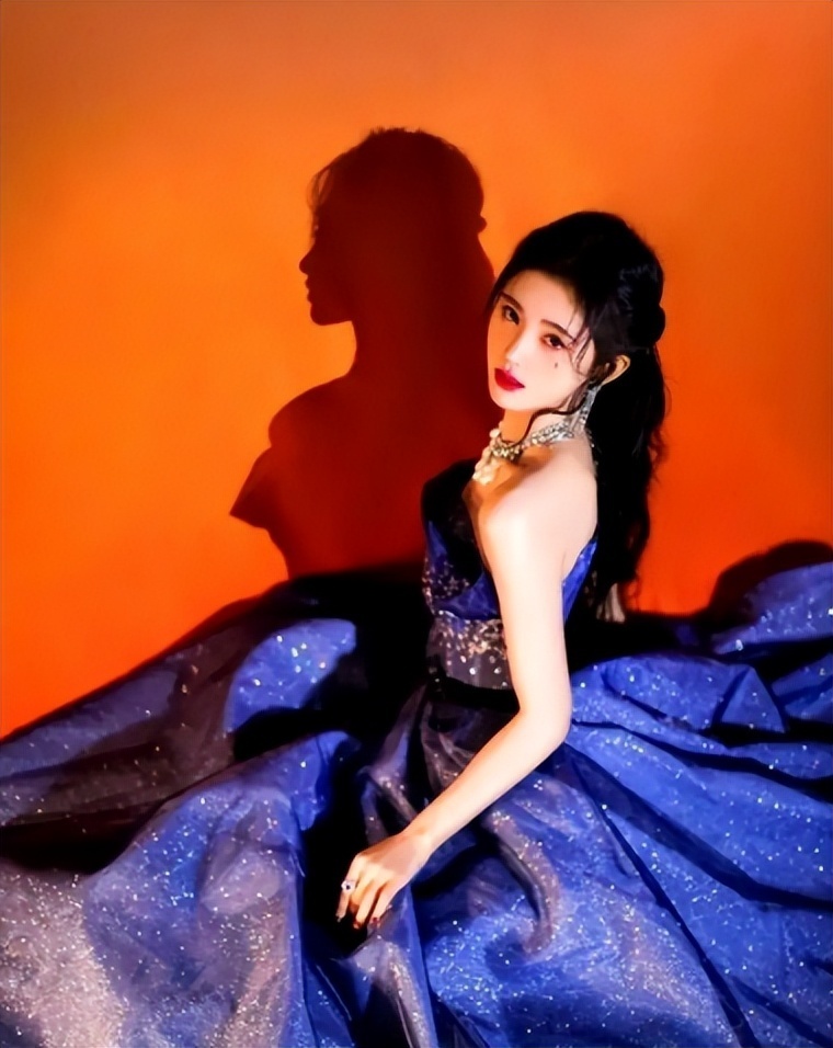 这次活动,她还穿了一套宝蓝色吊带裙,腰部镶嵌着蓝色的碎钻。