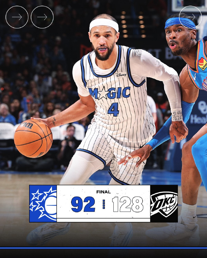 在上一场力克掘金之后,雷霆今天又在主场以128-92大胜魔术,取得两连胜,战绩来到40胜11负,继续排在西部第一。魔术则遭遇2连败,战绩变成25胜24负,排在东部第八。