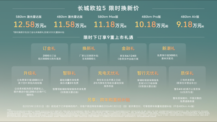 12月16日,长城汽车欧拉品牌全新A级纯电SUV——长城欧拉5正式上市。新车共推出5款配置,建议零售价区间为 9.98万至13.38万元,限时换新价9.18万元起(限时换新价包含“订金礼”和“换新礼”至高5000元以旧换新补贴)。为回馈广大用户的热爱与支持,即日起至2025年12月31日,用户下订并锁单即可尊享包含订金礼、换新礼、智行无忧礼在内的9重上市好礼,以及跨年购置税补贴(不含480km Air版)等丰厚购车权益。凭借诚意十足的价格权益与越级产品力,长城欧拉5致力于成为全球年轻用户的“严选搭子”。