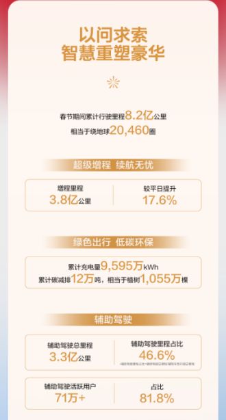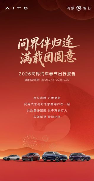 这个春节,问界用数亿公里的陪伴,温暖每一段奔赴团圆的归途;用7万余次主动守护,诠释了“安全是最大的豪华”;用春节不打烊的服务,让用户出行更省心、舒心和开心。智慧护航归途,爱意照亮前路,展望2026,问界汽车将携手每一位用户,持续探索智慧出行新体验,与万千家庭共赴美好新程。