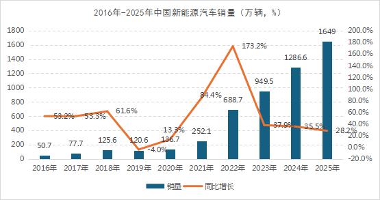 我们先来看看2016年到2025年中国新能源汽车历年销量情况。