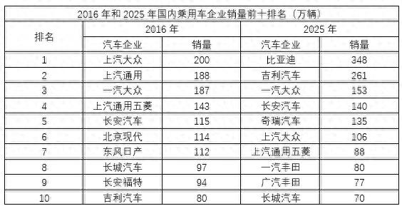 我们先来看看2016年和2025年国内乘用车销量前十排名车企的变化情况。2016年,位居乘用车销量前十的合资品牌有上汽大众、上汽通用、一汽大众、上汽通用五菱、北京现代、东风日产和长安福特共7家,合计销量约1083万辆,而自主品牌只有长安汽车、长城汽车和吉利汽车共3家,合计销量约292万辆;到2025年,位居乘用车销量前十的合资品牌有一汽大众、上汽大众、上汽通用五菱、一汽丰田和广汽丰田共5家,合计销量约504万辆,自主品牌有比亚迪、吉利汽车、长安汽车、奇瑞汽车和长城汽车共5家,合计销量约954万辆。在这分排名表上,十年时间,合资品牌的销量占比从2015年的78.8%,下滑到2025年的34.6%,下滑幅度惊人!