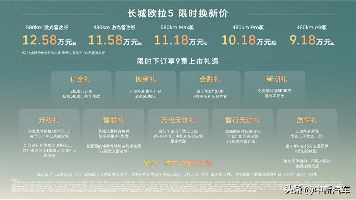 2025年12月16日,长城汽车欧拉品牌全新A级纯电SUV——长城欧拉5正式上市。新车共推出5款配置,建议零售价区间为 9.98万至13.38万元,限时换新价9.18万元起(限时换新价包含“订金礼”和“换新礼”至高5000元以旧换新补贴)。为回馈广大用户的热爱与支持,即日起至2025年12月31日,用户下订并锁单即可尊享包含订金礼、换新礼、智行无忧礼在内的9重上市好礼,以及跨年购置税补贴(不含480km Air版)等丰厚购车权益。凭借诚意十足的价格权益与越级产品力,长城欧拉5致力于成为全球年轻用户的“严选搭子”。