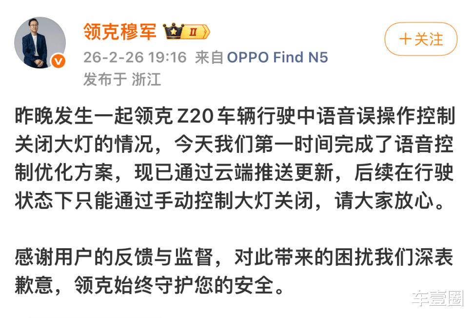 关于领克Z20因语音指令识别错误而引发事故,厂方的回应还算及时,态度也较为诚恳。2月26日,领克汽车销售有限公司副总经理穆军在其个人微博上公开回应:“今天我们第一时间完成了语音控制优化方案,现已通过云端推送更新,后续在行驶状态下只能通过手动控制大灯关闭,请大家放心。”