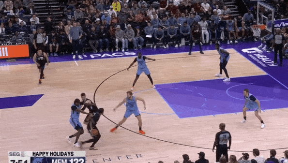 灰熊重兵被调度在强侧,菲利利用广阔的中路空间、伺机抓兰戴尔盯无球走神,空切得手。