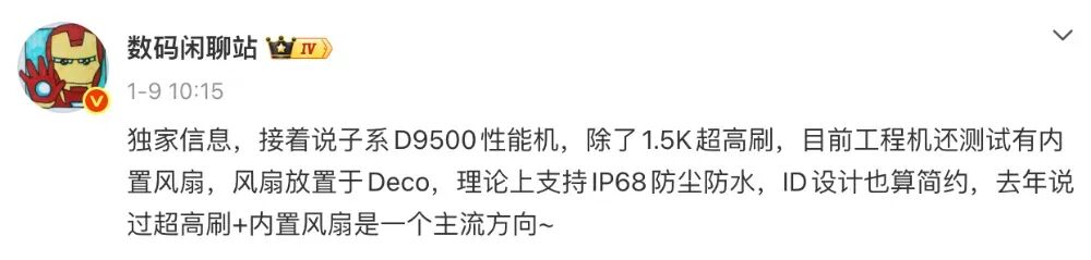 另外,这位博主的其他爆料还显示,一款“子系D9500性能机”,除了1.5K超高刷,目前工程机还测试有内置风扇,风扇放置于Deco,理论上支持IP68防尘防水,ID设计也算简约,超高刷+内置风扇是一个主流方向。