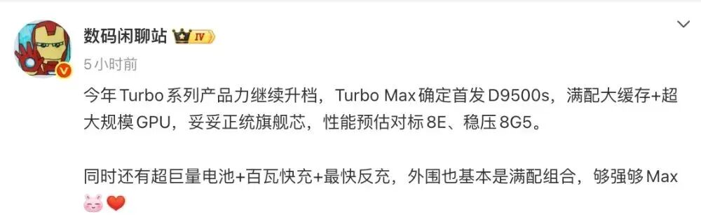 同时,参考博主@数码闲聊站 的爆料来看,今年REDMI Turbo系列产品力继续升档,Turbo Max确定首发D9500s,满配大缓存+超大规模GPU,性能预估对标8E、稳压8G5。还有超巨量电池+百瓦快充+最快反充,外围也基本是满配组合。