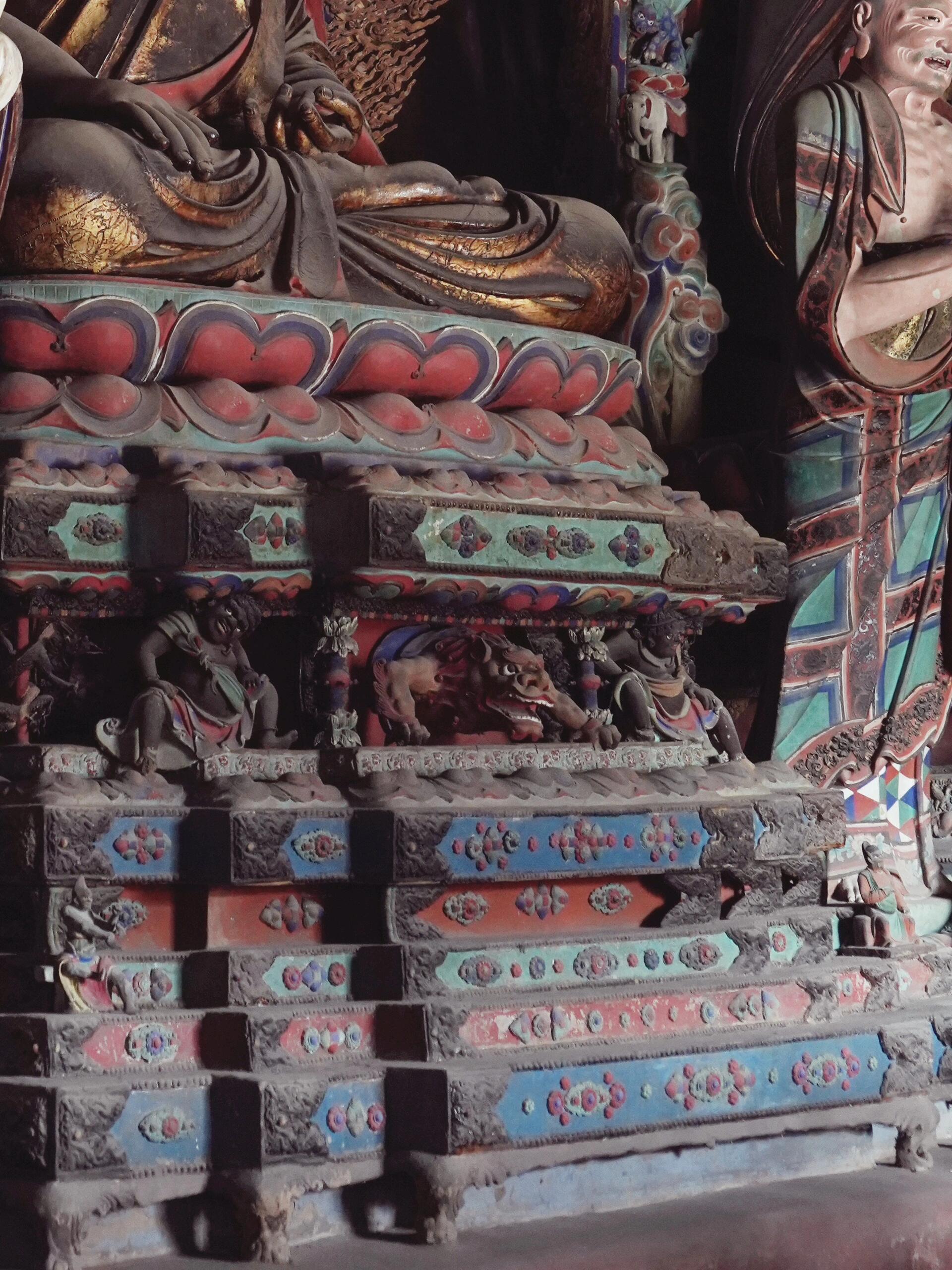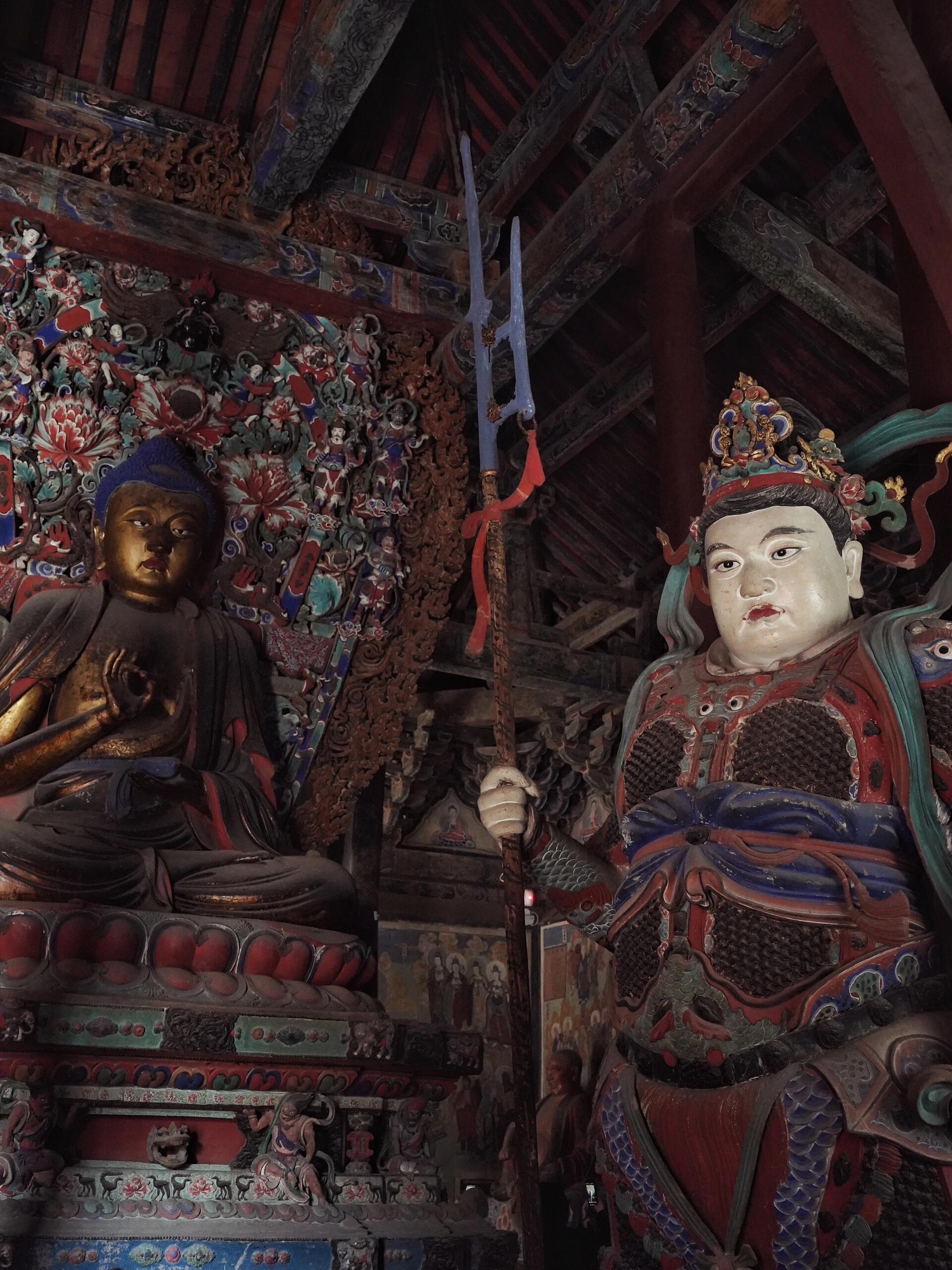 左侧的护法天王身体前倾,像要扑下来。铠甲上的鳞片刻得极深,能塞进指甲盖,鳞片里积着的灰,捻开来看是黄黑色的,混着几百年的香火气。天王的眼睛瞪得溜圆,眼珠是黑琉璃做的,被香火熏得蒙了层灰,可那股子凶劲一点没减,老郑说有回夜里起风,窗户没关好,他看见天王的影子在墙上晃,吓得他赶紧烧了三炷香。