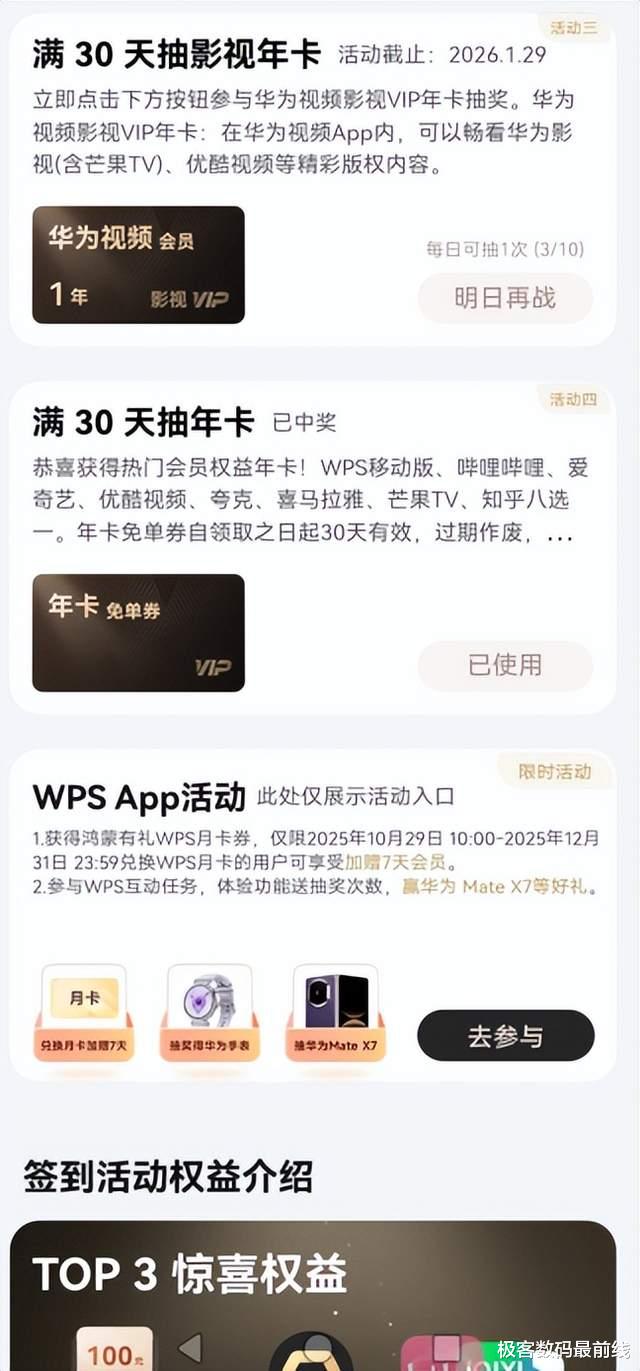 而且首签后第30天就能解锁鸿蒙有礼的“大招”, 有机会参与华为影视VIP年卡抽奖活动。签到满30天还能参与年卡免单券抽奖活动,有机会在哔哩哔哩、爱奇艺、芒果TV等八大热门应用年卡里任选其一。抽中实现一整年追剧自由啦!