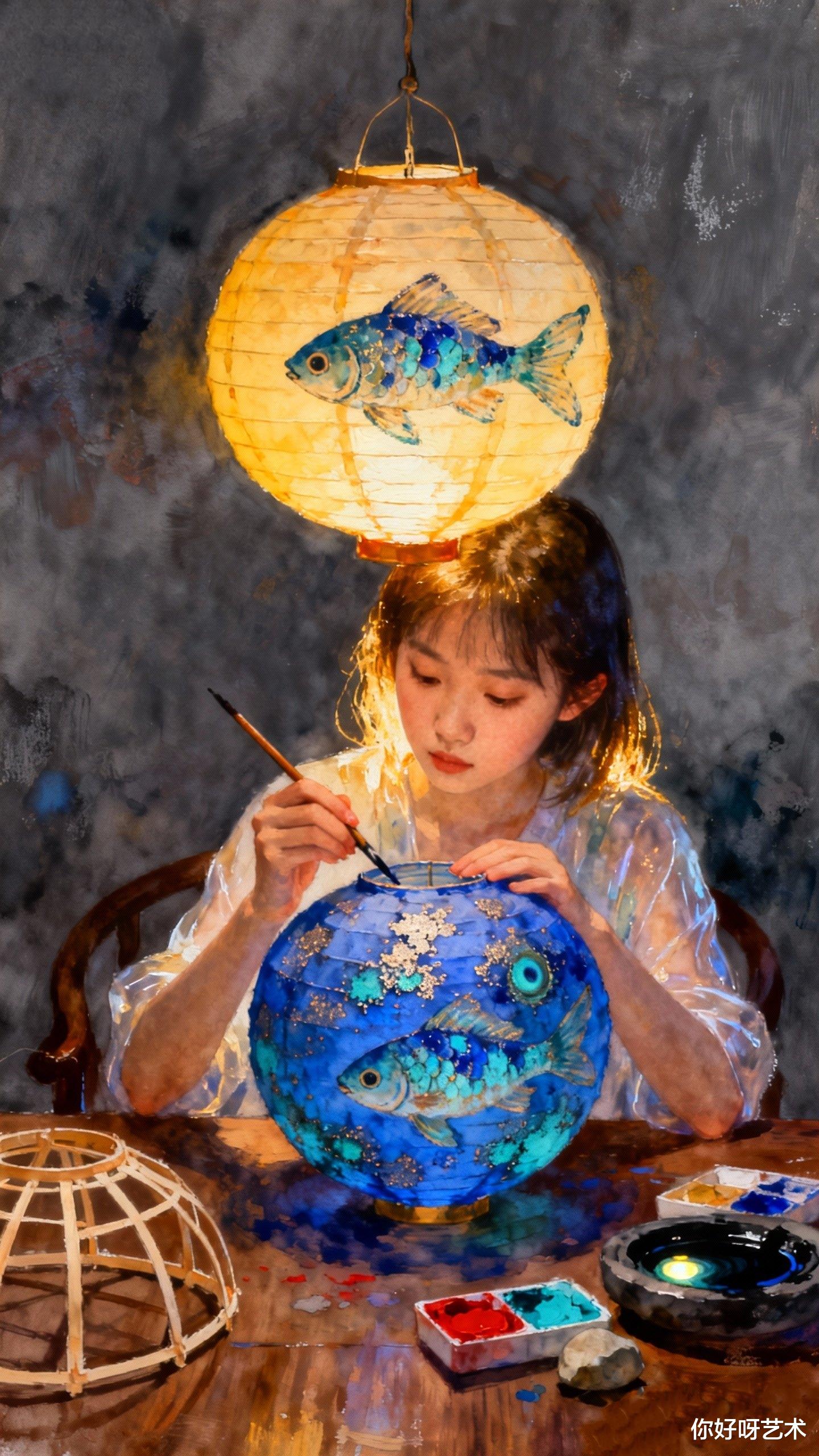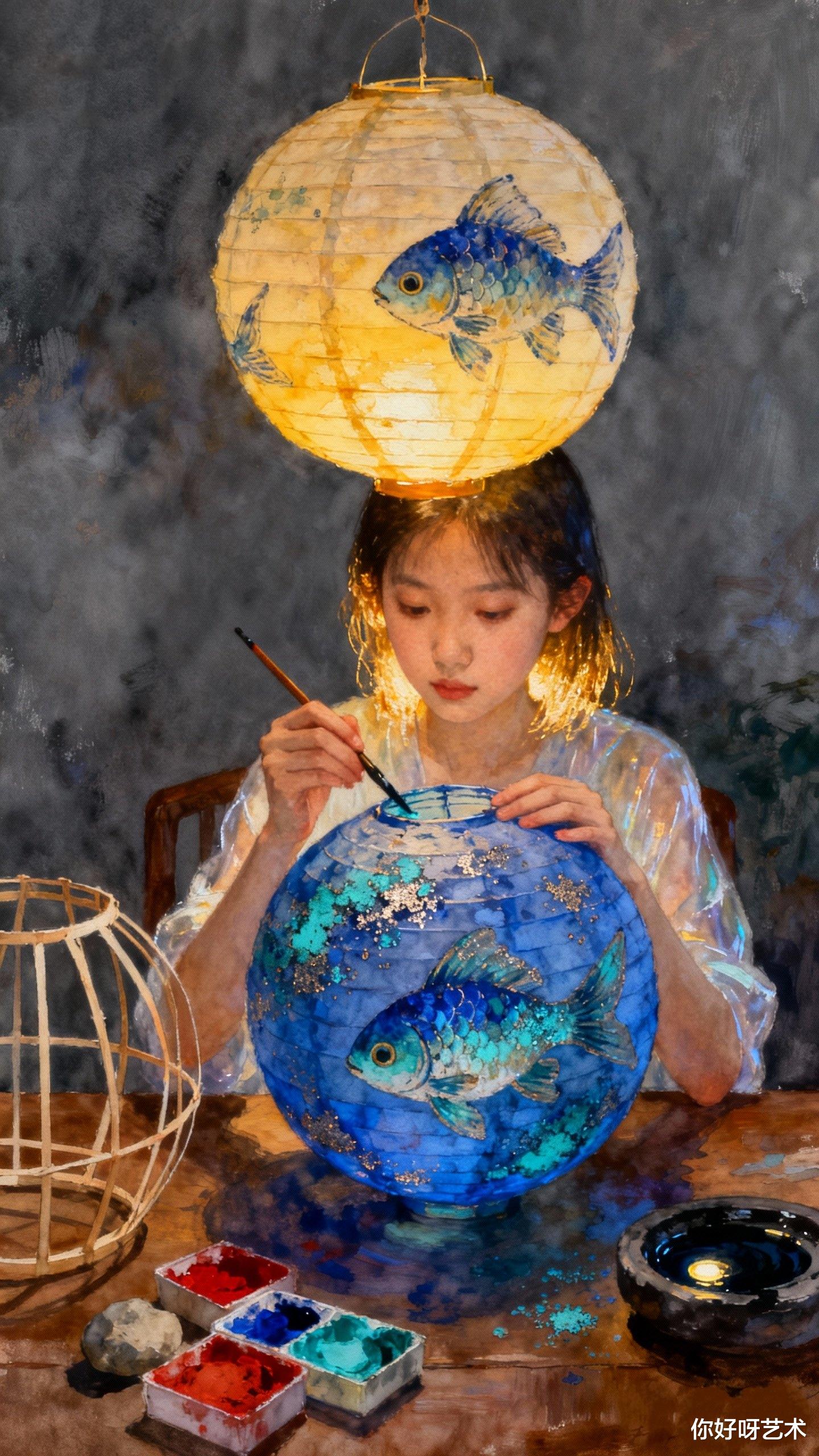 这场景让我想起幼时在江南老宅的见闻。那时祖母总在冬月初三这天,用红纸剪出鲤鱼的形状,贴在井沿上,说这是“鱼神巡游”的日子。井水会泛起细小的波纹,仿佛真有生灵在深蓝中穿梭。如今祖母的剪纸早已褪色,而画中的鱼却有了生命——它们从少女的衣袖游向画布边缘,鳞片在晨光中折射出虹彩,仿佛下一秒就要跃入现实。