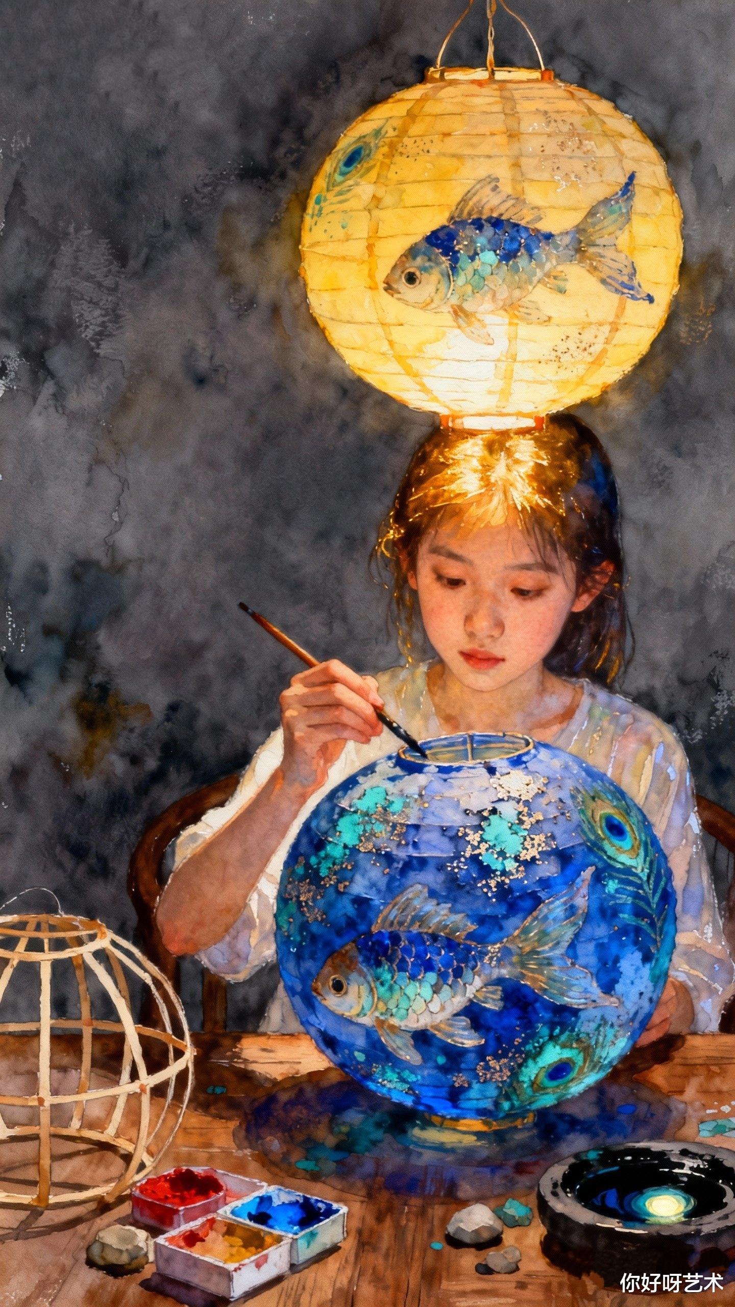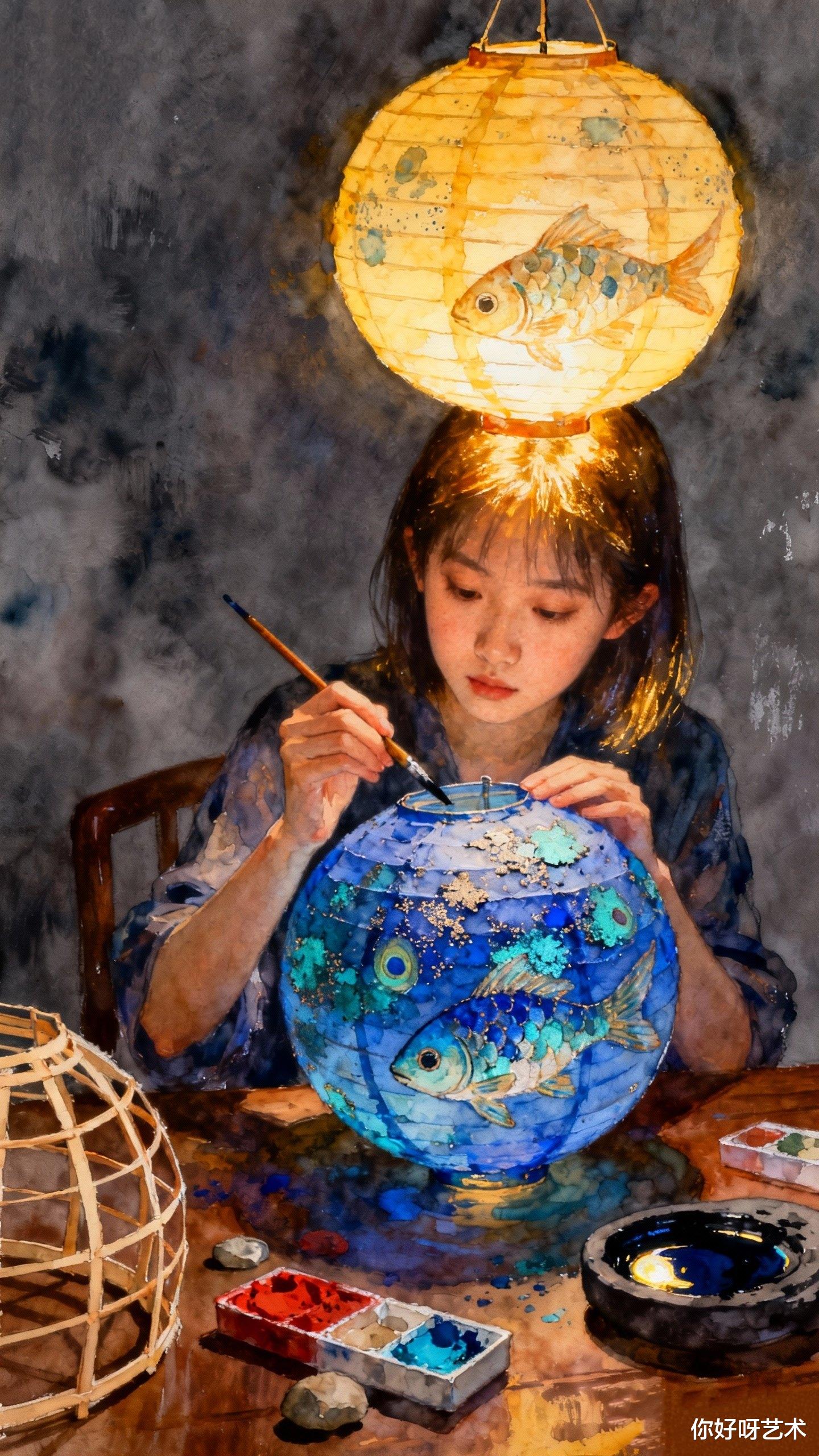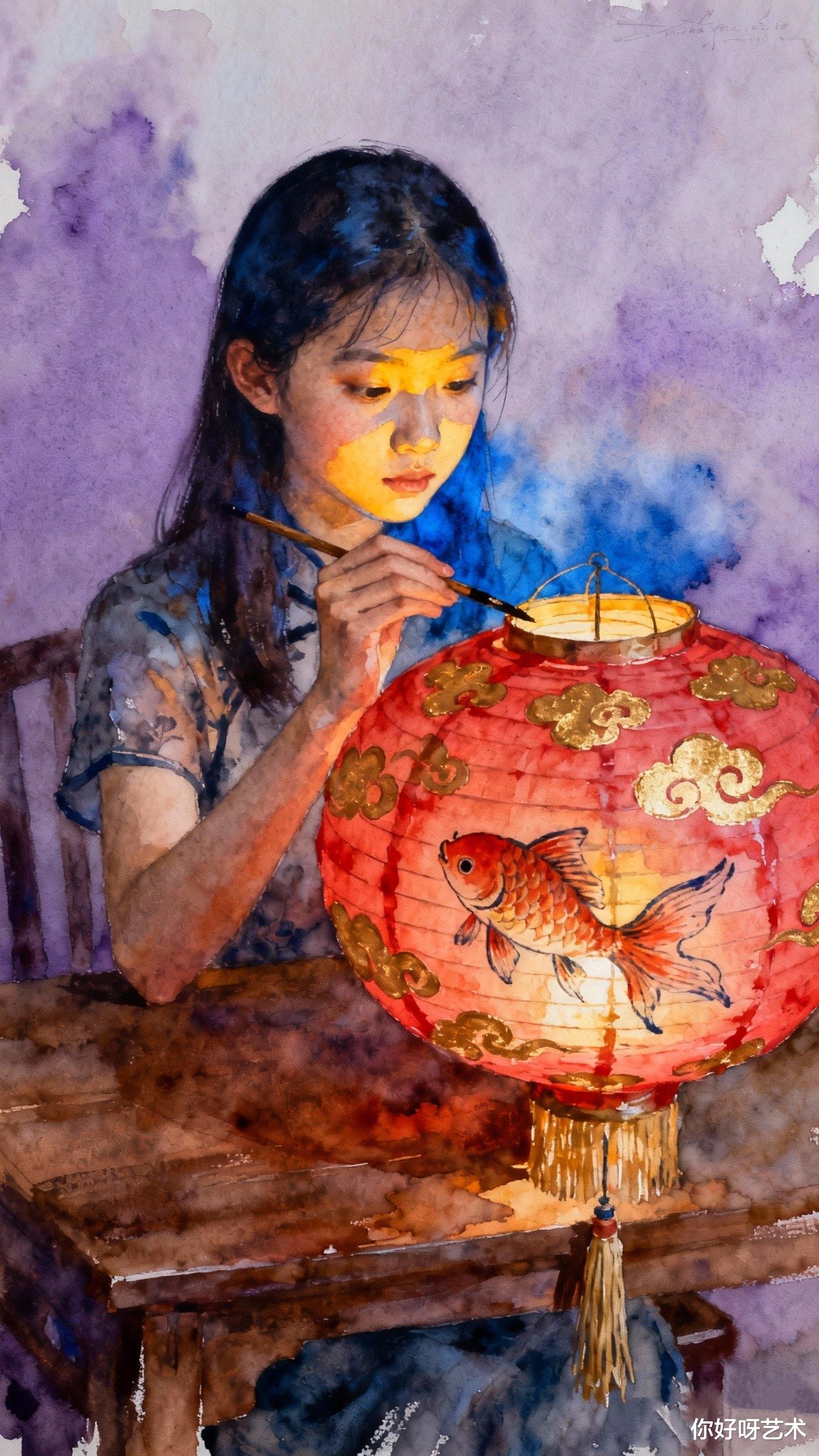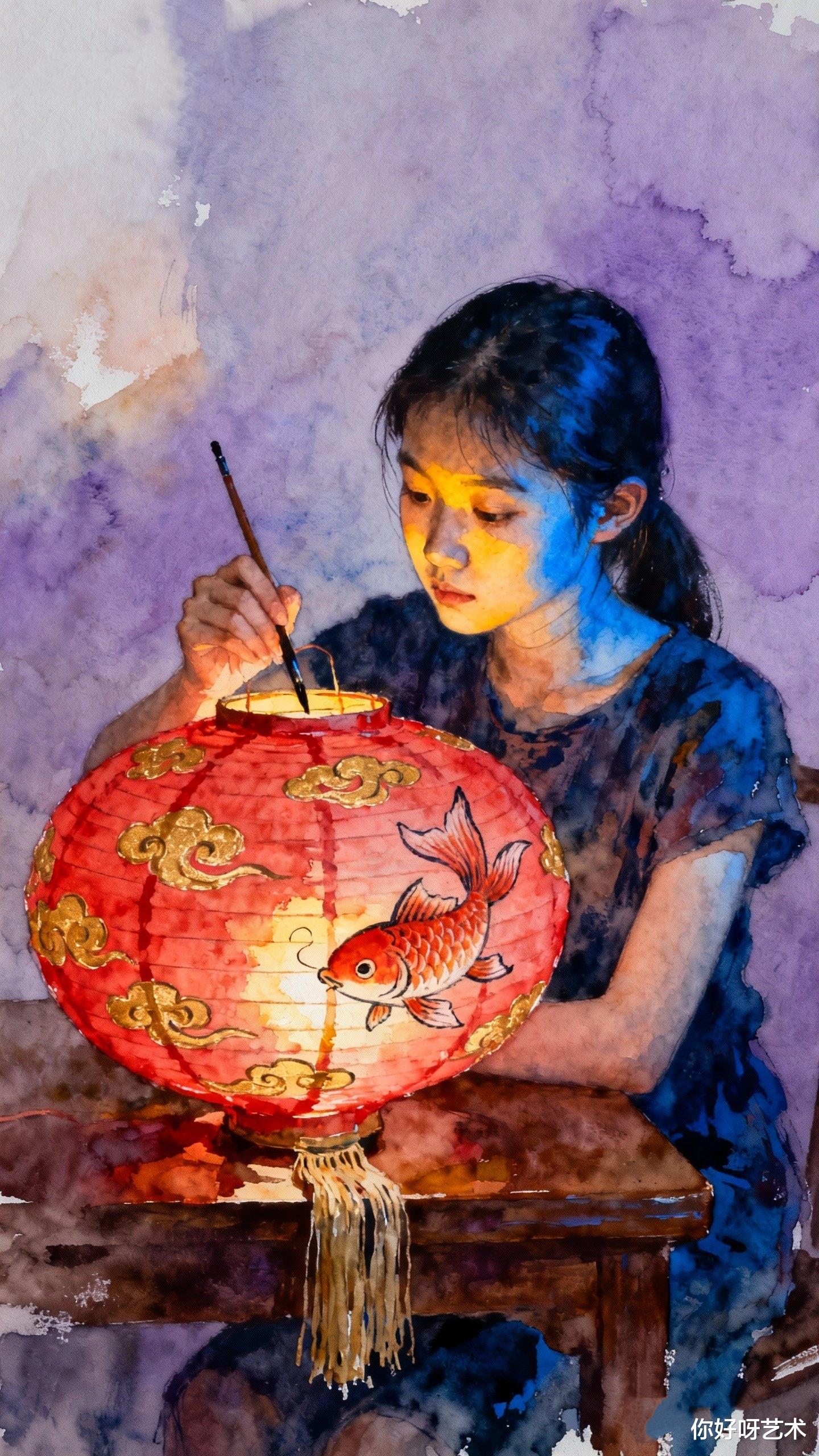 冬月初三的寒风仍在窗外呼啸,但画室里的水彩已经干透。少女的裙裾在晨光中微微泛黄,而鱼群的朱红色则愈发鲜艳。我收起画笔,知道这幅画永远不会完成——因为每当季节更替,画中的鱼就会游向新的水域,而少女的指尖,永远悬在将触未触的瞬间。