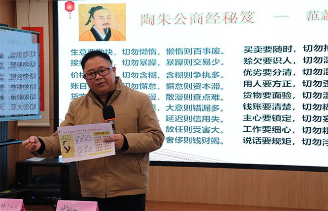 上海交通大学安泰经济与管理学院郑兴山教授在《范蠡商道与现代企业实践》讲话中,从现代管理学的视角重新解读范蠡的商业智慧。他通过案例分析了范蠡“知斗则修备,时用则知物”的市场经济预见性,“夏则资皮,冬则资絺”的反周期经营策略对现代企业风险管理的启示。郑兴山教授认为,范蠡“逐什一之利”的薄利观与可持续发展理念高度契合,同时,强调了企业家必须“坚守道德底线”,不要忘记“客户是水,企业是舟。”客户是成就企业发展的重要因素,任何欺骗客户的行为,其实是企业慢性自杀的行为。郑教授在演讲中,还举几个案例说明:“企业家不讲诚信经营,最后肯定自食其果”。他还指出,范蠡善于“察时变”的商业智慧对当今数字化转型中的企业同样具有指导意义。