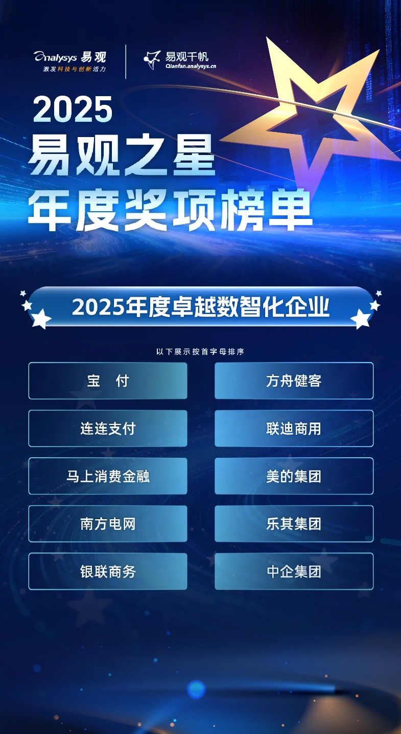 “获奖企业代表了产业数智化转型的‘灯塔’。它们不仅完成了自身核心业务的数字化重塑,更将数据与智能能力贯穿于全价值链,实现了运营模式、商业模式乃至组织模式的创新,并积极以自身实践赋能产业生态。”易观方面称。
