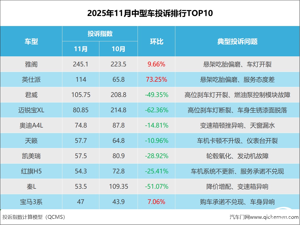 近日,2025年11月中型车投诉指数出炉。数据显示,中型车总体投诉指数为1688.2,环比暴跌21.35%。在本月投诉榜TOP10中,指数下跌车型占据7席,其中降幅最大车型为迈锐宝XL,降幅达62.36%。究其原因,2020-2023款迈锐宝XL的燃油泵控制模块故障大量召回,或起到了降低投诉的作用。而三款投诉指数上涨车型中,英仕派涨势最猛,凭73.25%的涨幅占据榜眼位置,除悬架吃胎偏磨这老生常谈的问题外,售后人员的服务态度也使不少车主十分不悦。