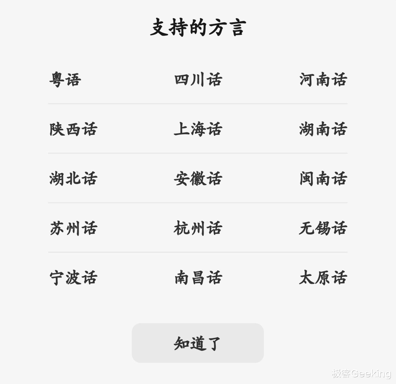 支持中文、英文和多种方言的语音识别,其中方言包括粤语、四川话、河南话、陕西话和上海话等 10 多种。