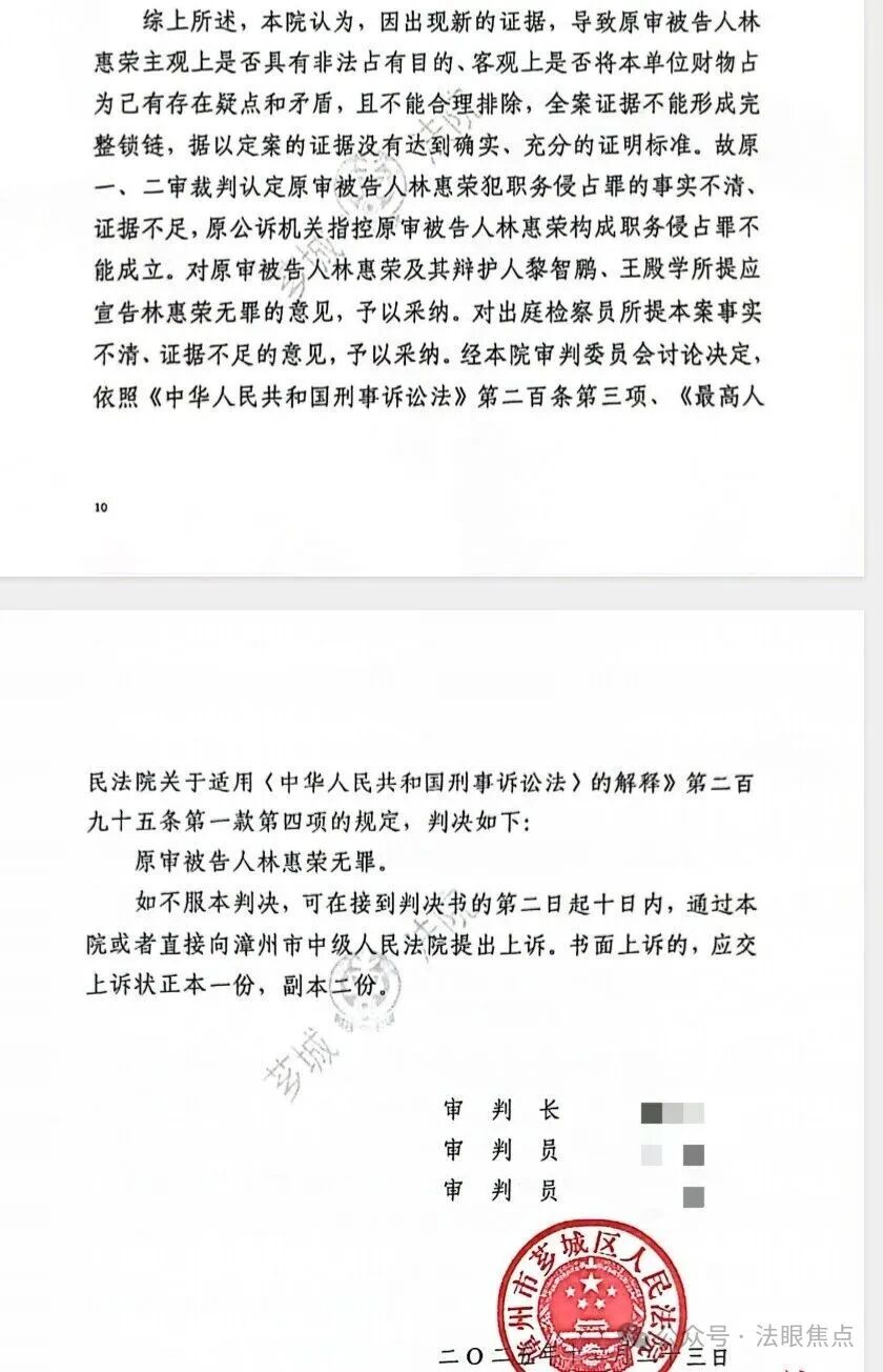 2025年12月23日,芗城区人民法院作出重审一审判决,宣告林惠荣无罪。