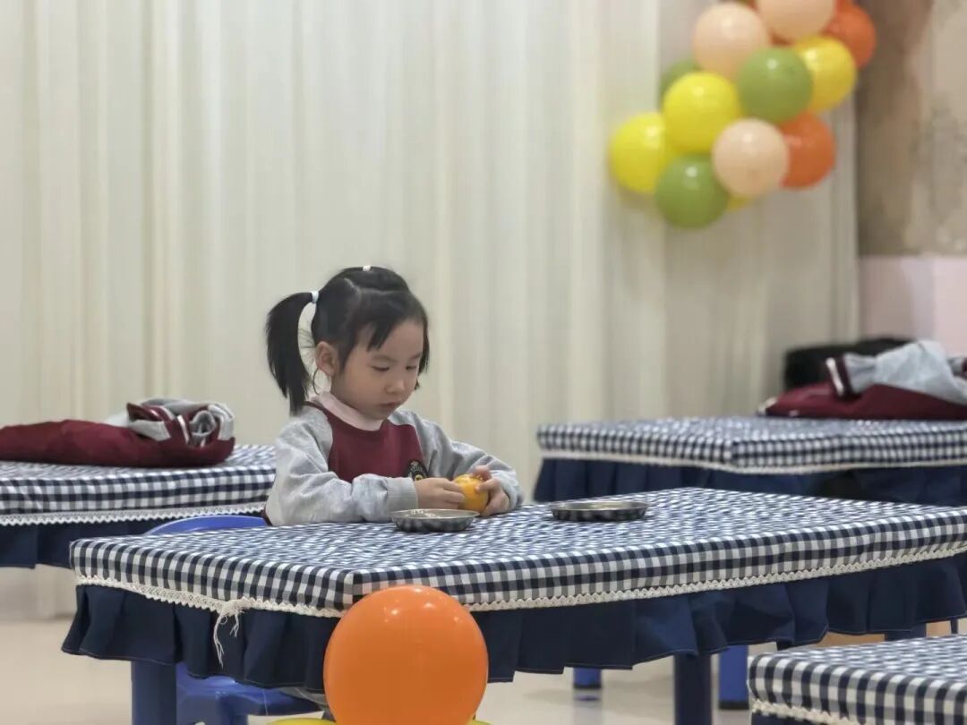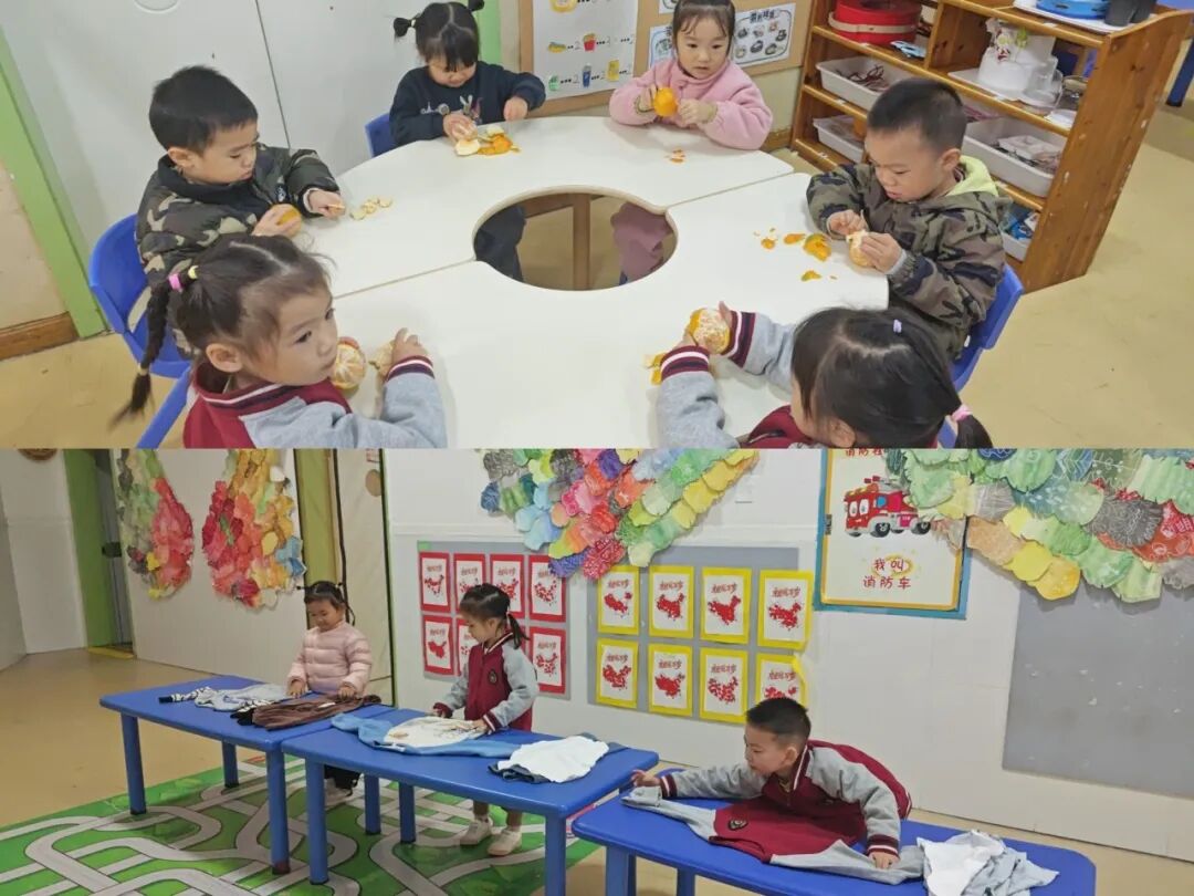 中班的孩子们也不甘示弱,个个拿出“看家本领”,化身“生活小达人”,有条不紊地打包衣服、剥橘子、擦桌子扫地,迅速而专注。每一个技能都展现出他们在日常生活中的学习成果,诠释生活本领的进阶,绽放自信光芒。