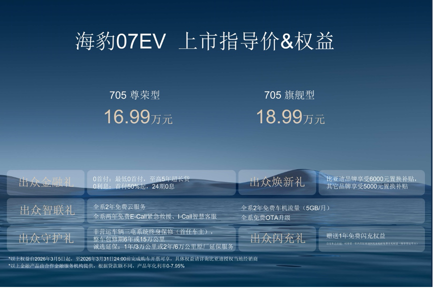 其中2026款海狮06EV官方指导价为15.99万元-17.99万元,并推出实力焕新礼、实力无忧礼、实力闪充礼、实力智联礼多重购车礼遇;海豹07EV官方指导价为16.99万元-18.99万元。