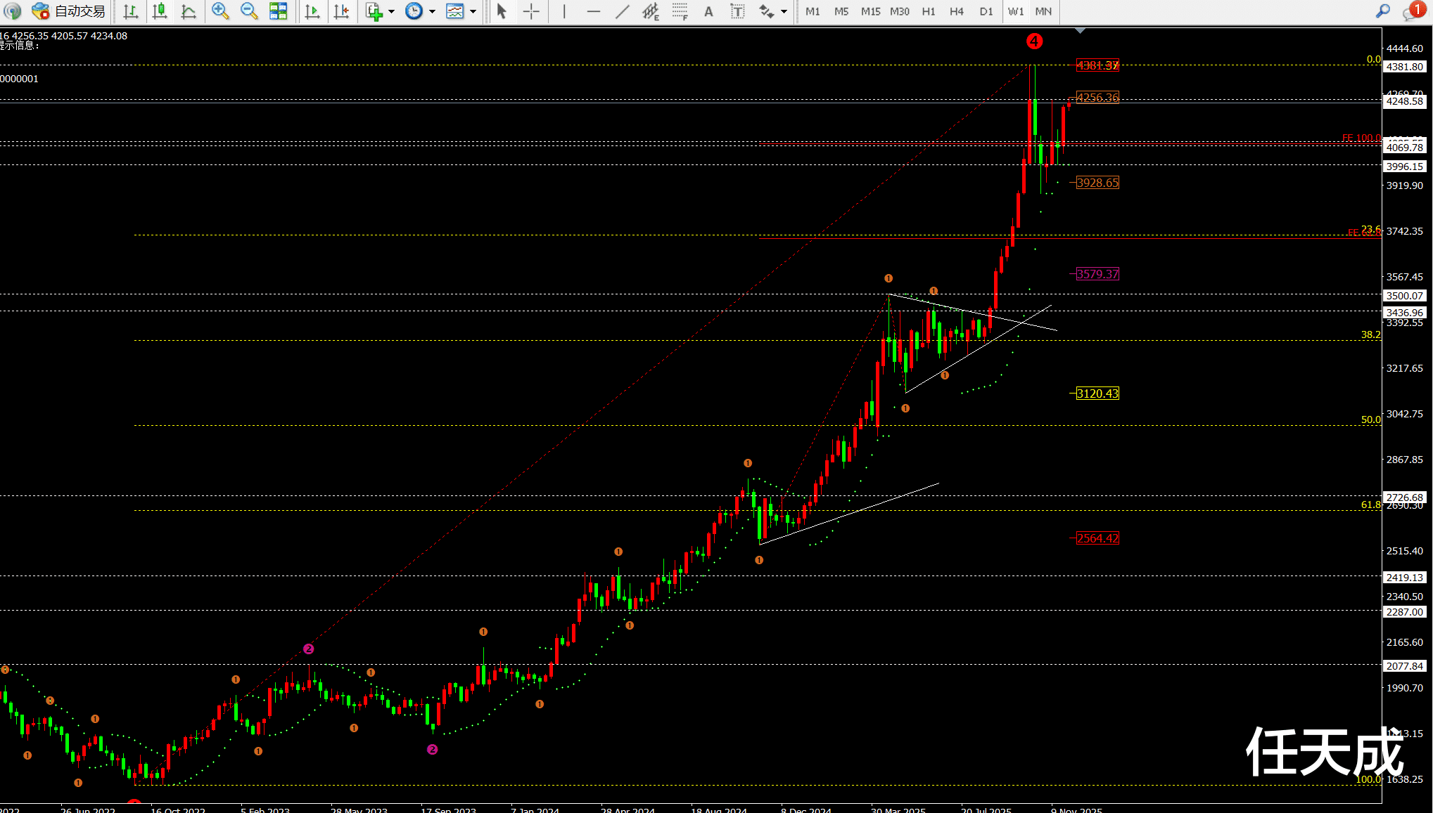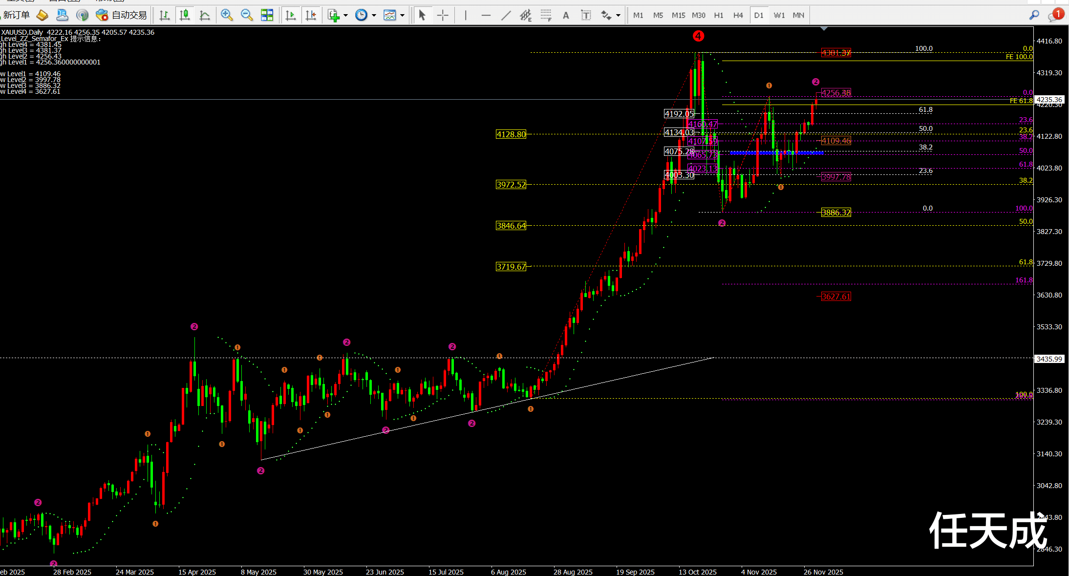 结合日线的斐波拉契回调线看目前支撑4192和4160-4173这一带。